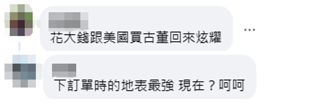 对于这一消息,有岛内网民表示,“花大钱跟美国买古董回来炫耀”“下订单时的地表最强,现在?”
