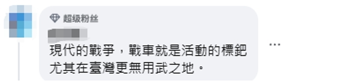 还有人说,“实在浪费钱,从机动速度慢,到台湾可作战区域少,可见实在浪费钱”“现代的战争,坦克就是活动的标靶,尤其在台湾更无用武之地”。
