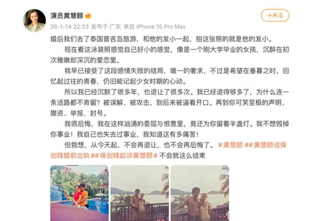 俗话说“君子动口不动手”,如今娱乐圈这出戏码却上演了真人版的法庭对决。1日晚,本该是万家灯火的日子,演员黄慧颐却心里憋着一团火,索性把压箱底的旧照翻了出来。照片里是她与保剑锋当年在普吉岛旅游的甜蜜时光,那时候两人正值热恋,谁能料到如今却成了反目的“呈堂证供”。这组照片一晒,瞬间点燃了网络的吃瓜热情,随之而来的是她一番近乎控诉的发文,字里行间满腹委屈,让人看了不禁唏嘘。