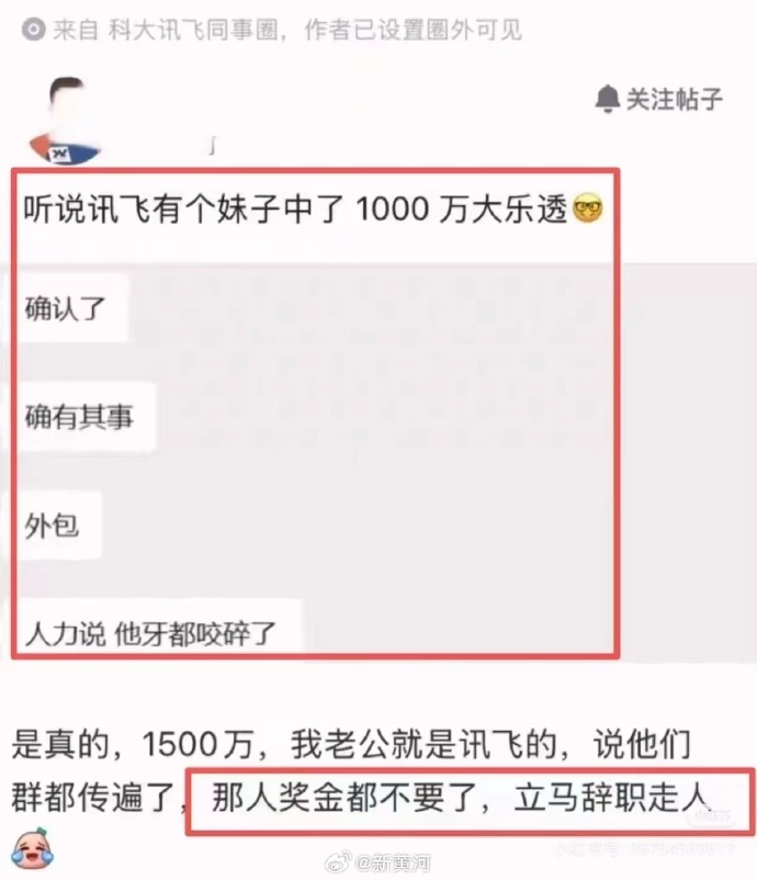 4日以来,在多个社交平台上,有讯飞员工万彩票后当场离职的消息受到广泛关注,但也有以讯飞员工身份的网友发帖质疑该事件。在社交平台,新黄河大鱼财经记者检索发现,众多关注大厂周边事件的账号均在发布相关讨论,而中奖金额有体万以及双色万两个版本。