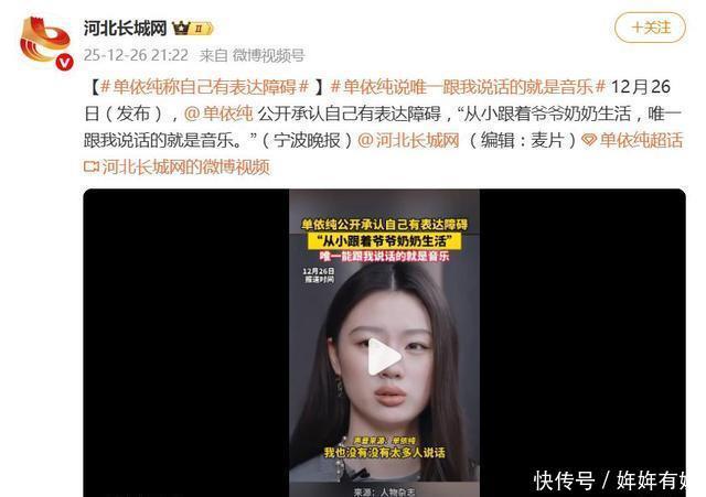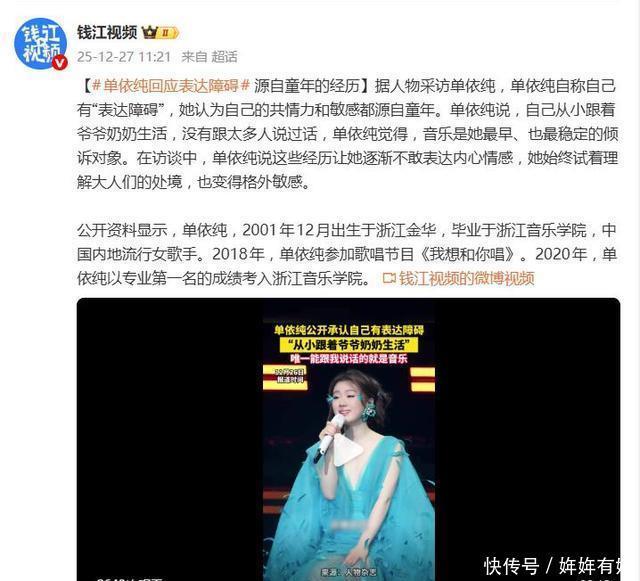 ?????? 一句“从小跟着爷爷奶奶生活,唯一跟我说话的就是音乐”,让歌手单依纯在近日的人物专访中,意外撕开了自己“天籁歌者”之外的另一个隐秘角落——长期被童年情感缺失所塑造的“表达障碍”。
