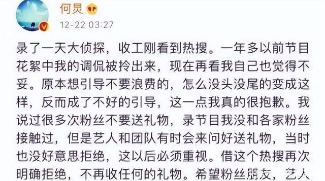 ?????? 在全网的口诛笔伐下,2020日,何炅在微博上发表道歉声明,表示:?????? 自己从未主动要求粉丝送礼,以后也不再收任何礼物,希望粉丝、艺人朋友和团队谅解配合。