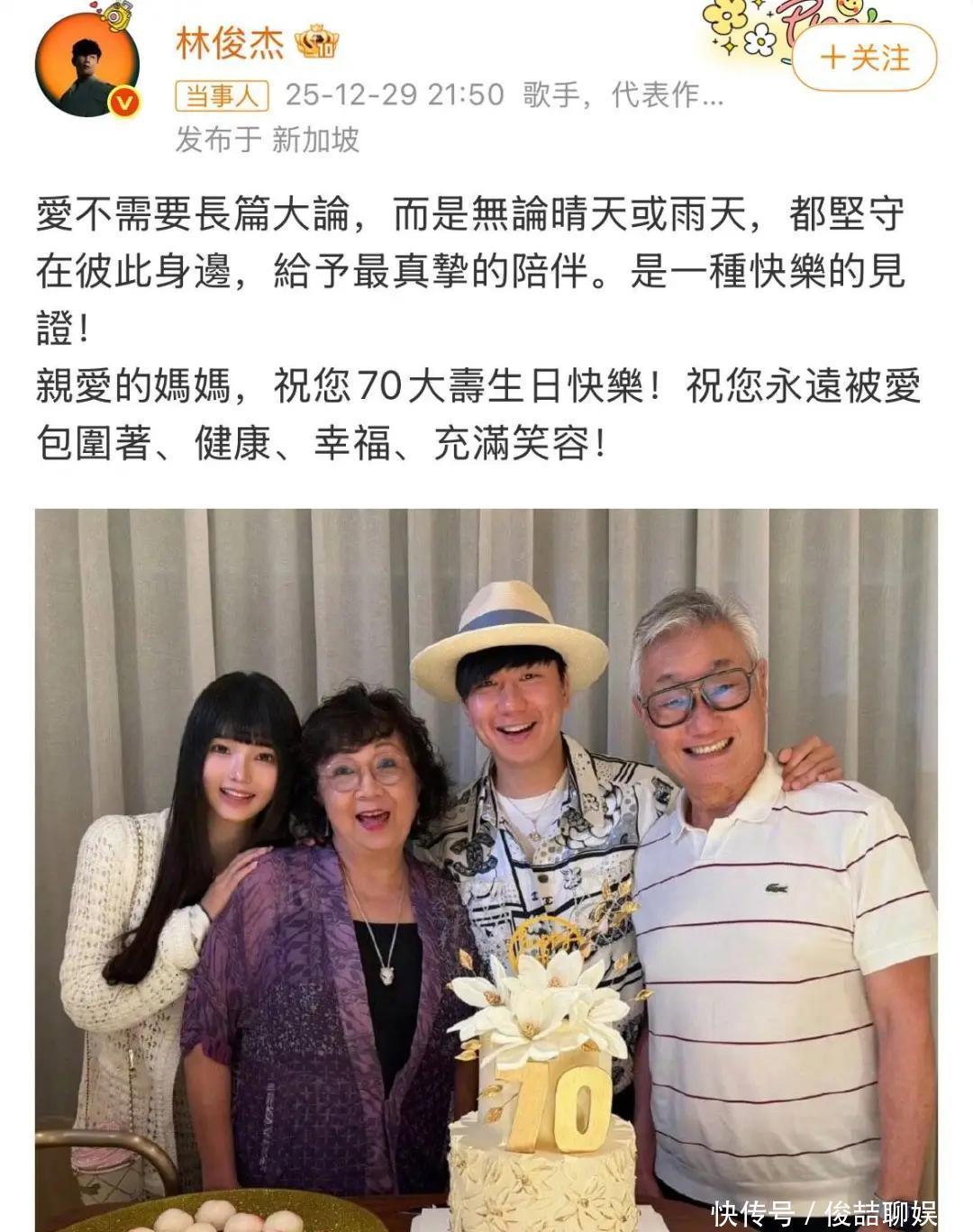 那个女孩,就是传说中的“她”。全网等待的“官宣”,藏在一张生日照里没有盛大的发布会,没有精心设计的文案。林俊杰选择用最家常的方式,把“她”带到了所有人面前。母亲七十岁生日,这个意义非凡的时刻,女友的入镜,胜过千言万语。这是一种无声的宣告。照片里的女孩叫七七,一岁的网红。比林俊杰整整小岁。年龄差像一道鸿沟,横亘在公众的审视里。之前,关于她的传闻就没断过。情侣装出游被拍,家庭背景被扒,粉丝论坛里一片反对的声浪。有人说她家底“不干净”,是搞灰色产业起家的。粉丝们喊着“抵制这个嫂子”,觉得她配不上舞台上光芒万丈的JJ。可林俊杰呢?他好像没听见。不解释,不反驳,只是这次,直接把人带回了家,带到了母亲身边。这张合影,像一颗温柔的炸弹,炸碎了所有猜测和抵制的泡沫。避嫌?不需要了。他就是要告诉全世界,他的选择,他负责。21岁的年龄差,是真爱还是各取所需?44岁的天王巨星,23岁的年轻网红。这个组合,太容易让人浮想联翩。吃瓜群众的脑洞开到了外太空。有人阴暗地猜测:“是不是女方手里有林俊杰的把柄?不然凭什么拿捏得住?” 这种桥段,电视剧里演烂了。可现实是,一个在娱乐圈沉浮二十年的顶级艺人,会被一个小姑娘用把柄威胁?这个猜测,本身就站不住脚。感情的事,从来不是简单的加减乘除。业内开始有另一种声音流传,听起来更接近生活的真相:女方怀孕了。 所以,一直低调处理的恋情,突然被摆上了台面。所以,家人欣然接纳,同框合影其乐融融。所以,这不再只是恋爱,而是关乎家庭与责任的新篇章。奉子成婚,在华人社会里,是一个带着传统色彩的选择。它意味着关系的升级,意味着双方家庭的捆绑。如果传闻属实,那么这张温馨的全家福,或许就是一场盛大婚礼的序曲。林俊杰给的,不仅仅是一个女友的身份,更是一个未来家庭的承诺。但抛开所有传闻,我们看到的,是一个男人在爱情里的坚定。粉丝的反对,外界的流言,年龄的差距,家庭的争议……这些都没有让他退缩。他用自己的方式,保护着这段感情,并且给了对方最大的尊重和认可。爱惨了?或许吧。 那种愿意与全世界稍稍为敌,也要把你护在身后的决心,装不出来。从舞台王者到居家男人,林俊杰变了?我们熟悉的林俊杰,是聚光灯下的音乐才子。他的声音能穿透灵魂,他的创作陪伴了一代人的青春。舞台上的他,是王者,是信仰。而照片里的他,卸下了光环。只是一个穿着简单T恤的儿子,一个搂着女友和家人的普通男人。笑容松弛,眼神温柔。那种幸福,是沉浸在家庭温暖里的人才会有的状态。这种转变,让人恍惚,也让人欣慰。原来,再闪耀的星星,也渴望人间的烟火。再成功的男人,也需要一个让他安心回归的港湾。爱情和家庭,或许就是他此刻最想谱写的,最私人的旋律。粉丝的心情很复杂。像自己珍藏多年的宝贝,突然被人捧在了手心。会担心,会挑剔,会害怕他受伤。可看到他笑得那么开心,那些反对的话,是不是也该慢慢咽回去?爱他,不就是希望他幸福吗?