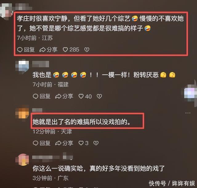 ?????? 还有的表示:“宁静是出了名的难搞,所以才会没戏拍?!?????? 就像她前半截很乖,后半截,又说大家要有嘴时,无人理的情况下,她还一一的点出了刘嘉玲的名字。