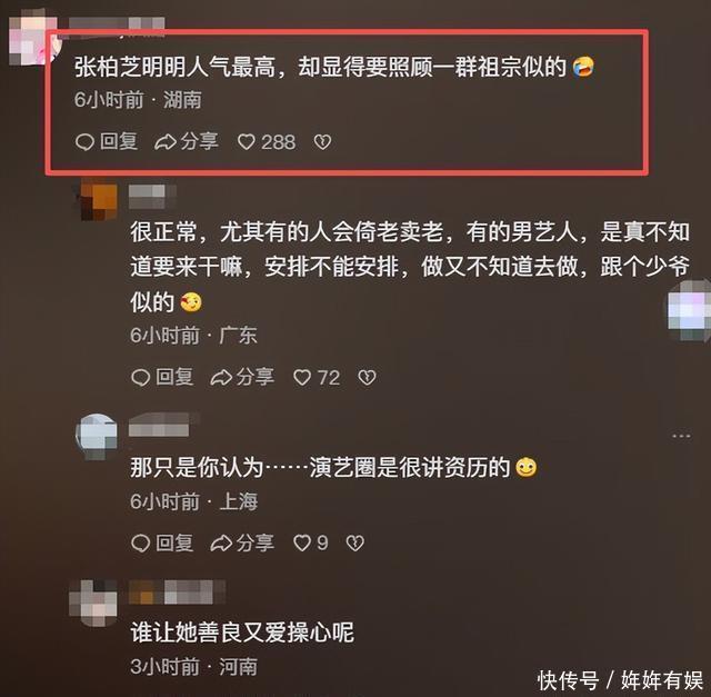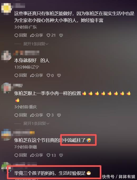 ?????? 人家热评道:“张柏芝人很好,跟上一季的李小冉一样,是中流砥柱。”?????? 也有的表示,有着三个孩子,生活经验很足。