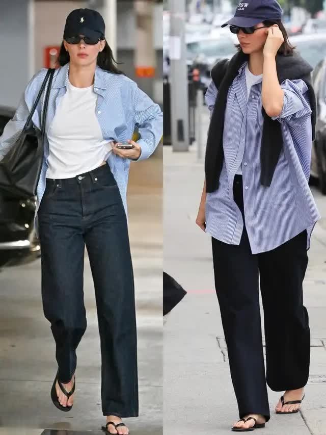 想尝试更清爽的搭配,可选一件蓝色的衬衫或是条纹衬衫,内搭同样选择一件纯白色的圆领 T 恤加上一条牛仔直筒裤,脚踩一双人字拖,头戴含有运动元素的棒球帽,轻松打造出元气又个性时髦的出街造型。