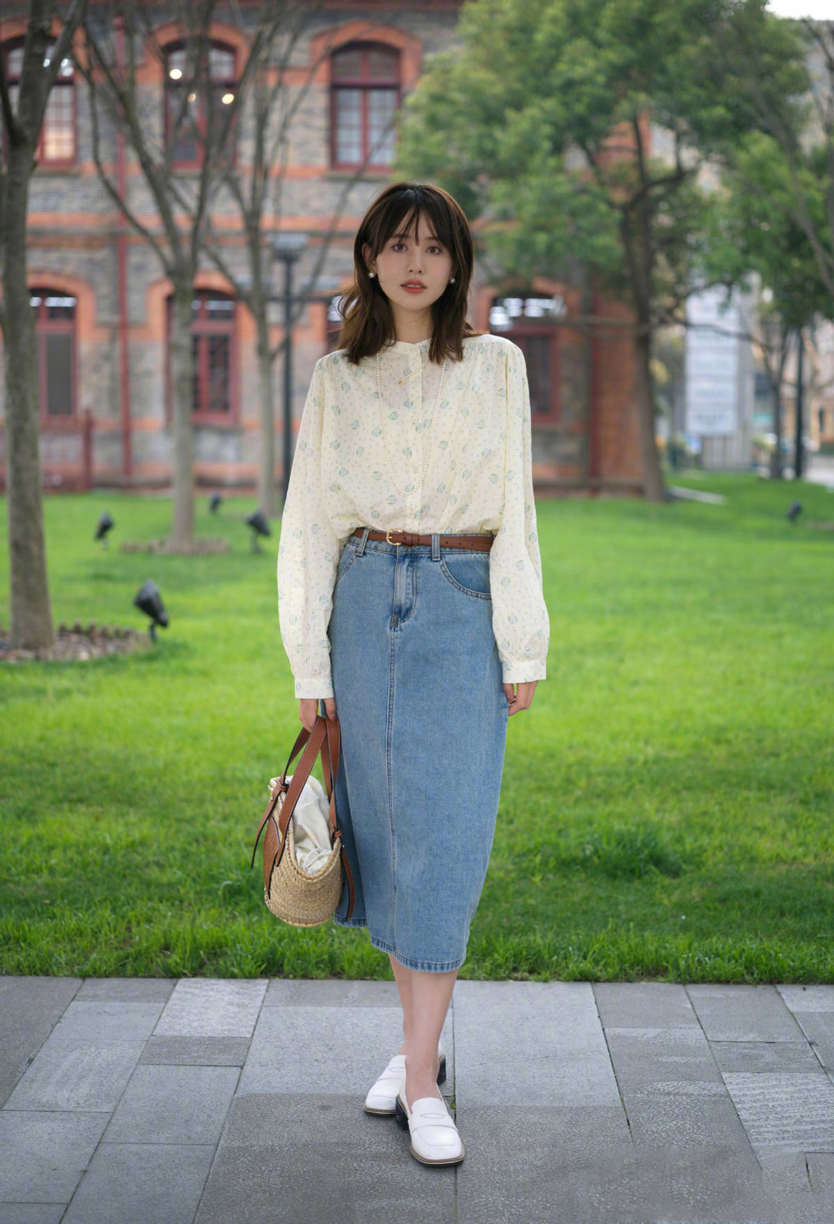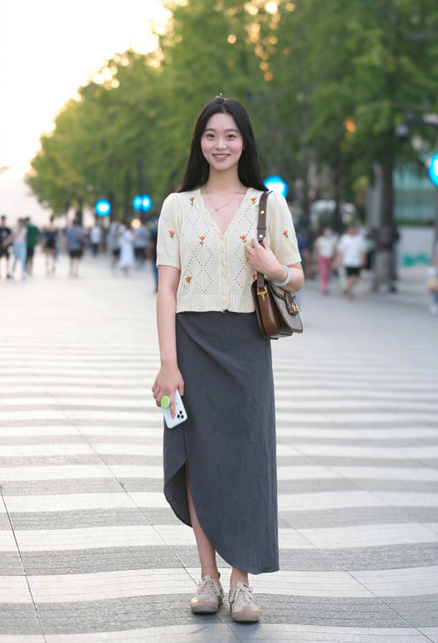 半身裙对身材微胖的女生也十分友好,可利用裙摆遮掩腿粗、屁股大的问题,达到遮肉显瘦的效果,优化身材塑造。要注意裙长控制在脚踝或小腿位置,突出纤细部位,适当留白,这样整体造型才更显轻盈显瘦,不会显得臃肿、拖沓。