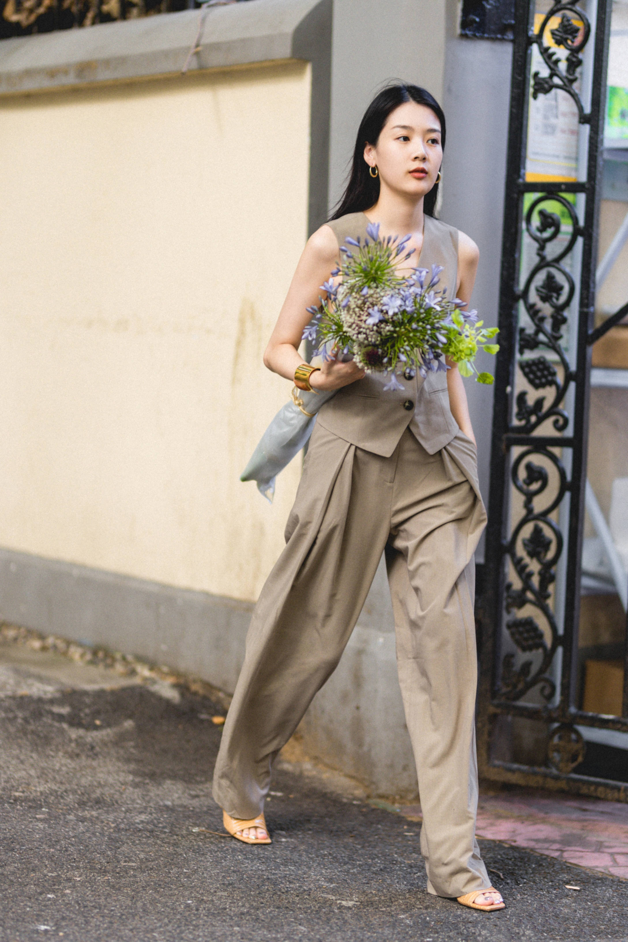 许多人觉得套装单品看起来呆板、土气,实则是不懂选款与搭配。西装马甲搭配西装阔腿裤,套装造型可拉长纵向比例,显高又塑形。注重服装面料质感,选择垂感佳、挺阔度高的款式,搭配带跟凉拖鞋,既时髦又高级,轻松营造出老钱风格。