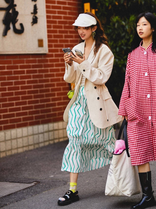 穿着半身裙时,不一定要搭配同风格单品,也可与西装外套混搭,融合正式与休闲风格,轻松打造出毫不费力的时髦与高级感。而且这种混搭有助于强化造型风格,不拘泥于单一风格,轻松吸引街头目光。