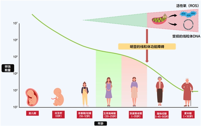 研究发现,女性出生时卵巢中约万万个原始卵泡,但随着年龄增长,卵泡数量和质量都在下降。35岁后,这种下降呈现断崖式趋势。而卵泡质量下降的核心原因,正是线粒体功能衰退。