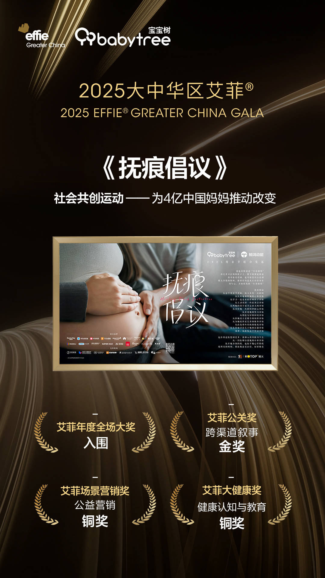 12日,备受行业瞩目的艾菲国际盛典(Effie UnthinkableFestival)正式启幕,获奖名单正式揭晓。艾菲奖是全球以“实效”为评估标准的标杆,为全球广告主和代理商所公认的杰出营销传播奖项。大中华区艾菲奖由中国广告协会主办,致力于表彰最具实效的营销传播作品,推动实效理念、为实效营销驱动者提供深度对话平台,从而提高行业实效标准。在本次评选中,宝宝树携手鲸鸿动能、胜加集团|耀火HOTOP发起的《抚痕倡议》社会共创运动,凭借其深刻的公众共鸣与社会影响力,入围艾菲年度全场大奖,并成功摘得“艾菲公关奖跨渠道叙事金奖”、“艾菲场景营销公益营销铜奖”、“艾菲大健康奖健康认知与教育铜奖”三大奖项。
