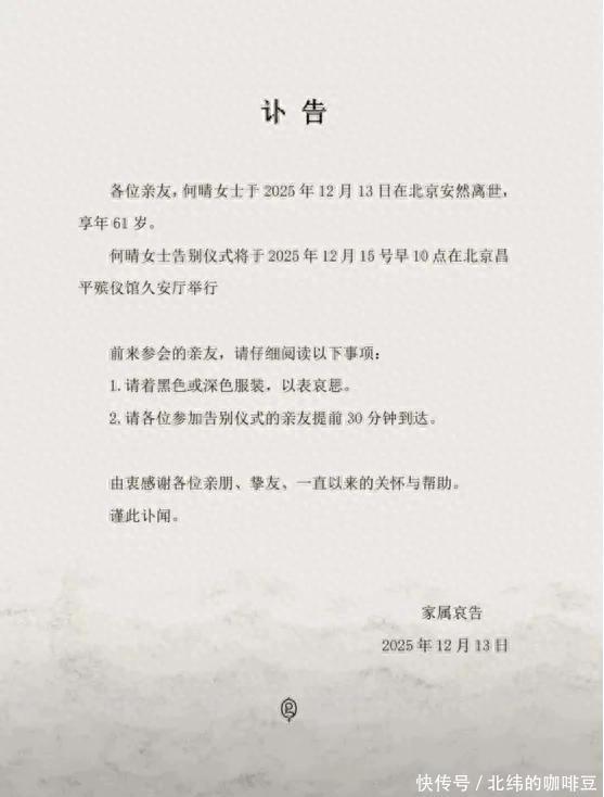 ?????? 12日,北京的冬天格外寂静。?????? 初雪后,一条讣告登上热搜:“知名演员何晴去世,享岁?!?????? 讣告只有寥寥数语,平静地告知了告别仪式的时间地点,没有过多渲染。