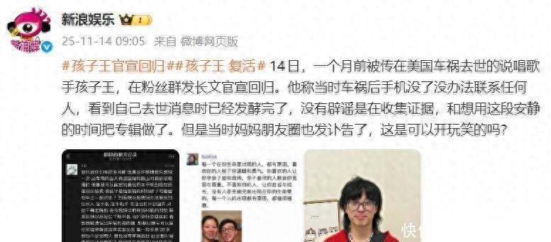 “这简直比电影剧本还离谱,哪有人能‘死’一个月才出来的?他妈的朋友圈讣告也是剧本的一部分吗?”“车祸可能是真的,但‘去世’的消息会不会是故意将计就计,就是为了给新专辑搞一波大炒作?现在这热度,哪个宣传比得上?”“最惨的是他妈,儿子‘没’了得发朋友圈,儿子‘复活’了还得在亲戚朋友面前解释一圈,这一个月心情像坐过山车?!?#34429然人没事是最大的好消息,但整个过程里确实有太多经不起推敲的地方,很多人心里都打了个问号:这到底是一场因意外引发的超级乌龙,还是一场精心策划的流量大戏?毕竟,连亲妈都“下场”了,这实在超出了常人能理解的范围。你觉得孩子王“死而复生”这件事,更像是一场无奈的意外,还是一次高级的炒作?欢迎在评论区说说你的看法!信源:新民晚报
