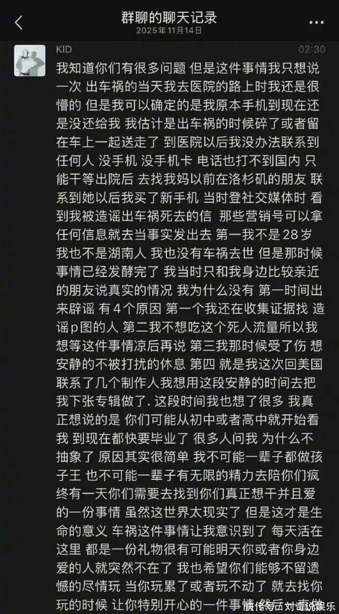 然日,孩子王突然在粉丝群发文,称自己并未去世,他解释车祸后手机丢失导致失联,待看到“被去世”新闻时,舆论已发酵,他暂未澄清,一方面收集证据,另一方面利用这段安静时间完成新专辑。