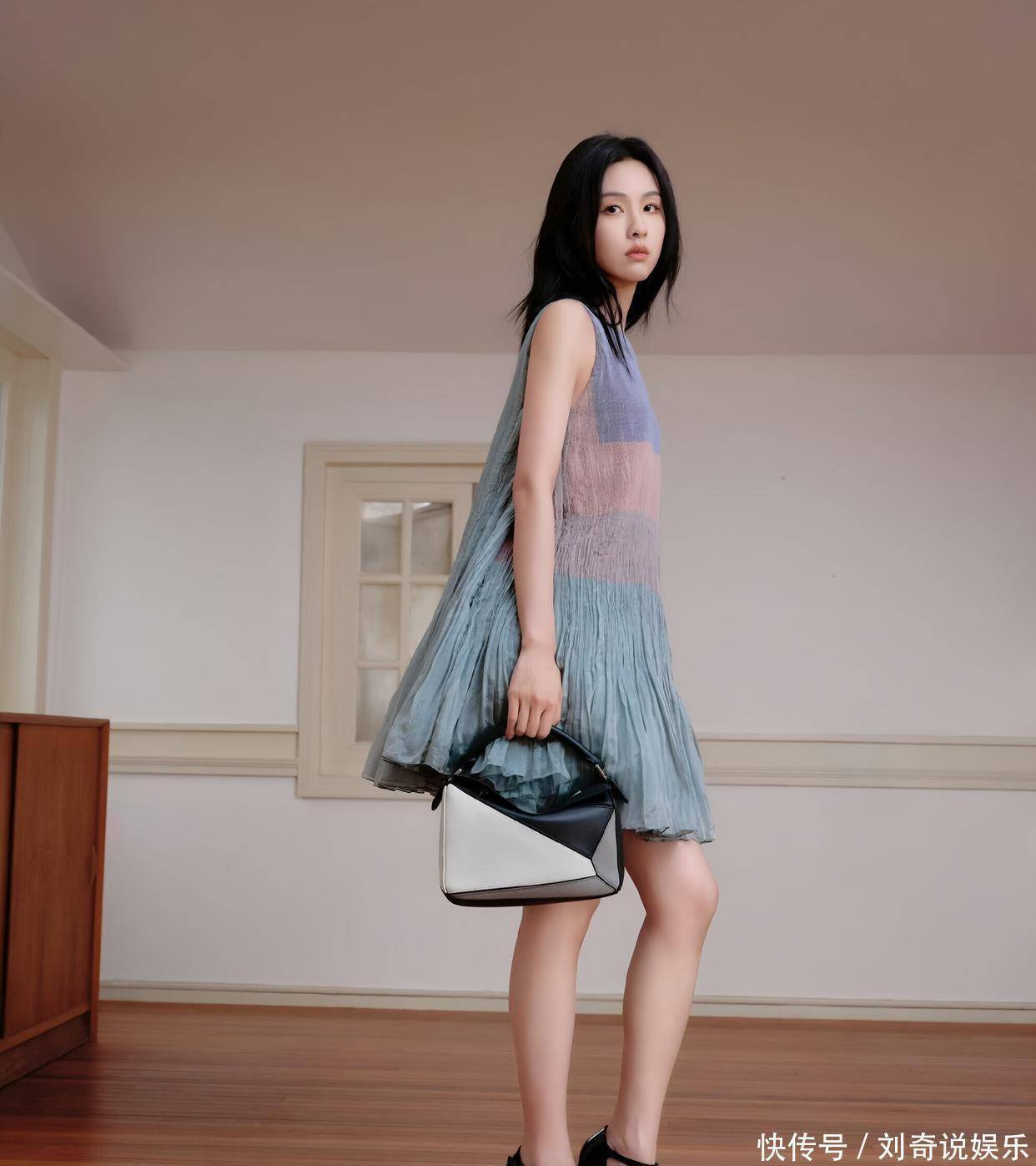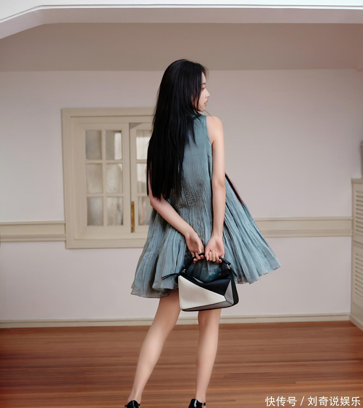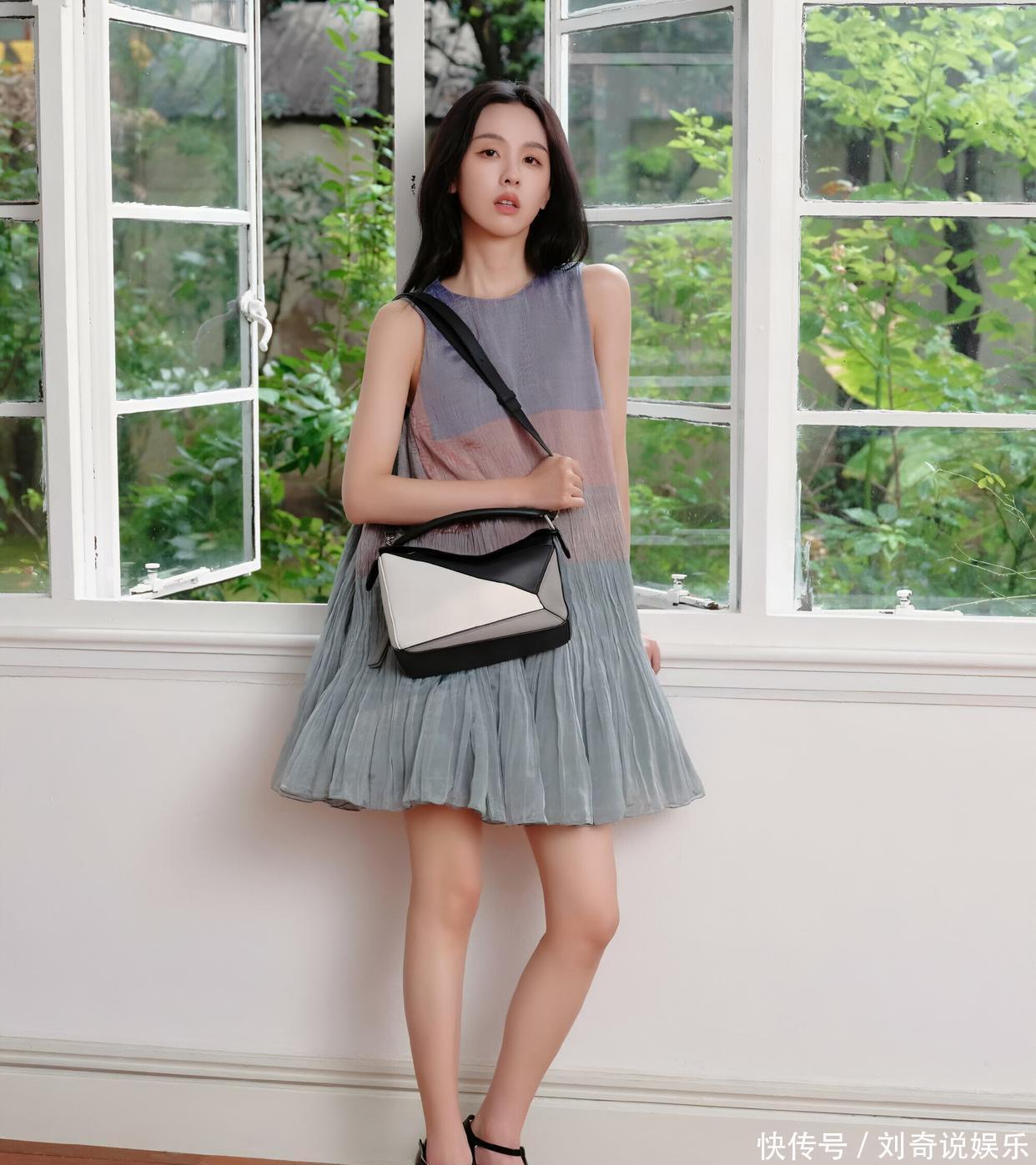裙子的面料轻薄透气,还带有细腻的褶皱纹理,让裙子在静态时也仿佛有了动态的美感。宽松的版型,对身材十分包容,穿上身既有慵懒的随性,又不失优雅的格调。裙摆是微微散开的 A 字 型,走动时,裙摆轻轻摇曳,像一片轻盈的云朵,又像一汪流动的春水,充满了浪漫的气息。搭配的拼色手提包,设计感十足。黑白灰的几何拼接,简约中透着时尚,包包的线条硬朗,与连衣裙的柔和形成了鲜明的对比,却又相互衬托,让整体造型更加有层次。这只包包就像一个 “fashion statement(时尚宣言)”,彰显着独特的品味与个性。脚上的黑色 T 字带高跟鞋,复古的设计,精致的做工,为整套穿搭增添了一份干练与优雅。鞋跟的高度恰到好处,既提升了身高,又不会让人觉得疲惫,很好地平衡了舒适与美观。整体来看,陈都灵的这套穿搭,将优雅与时尚完美结合,每一个细节都处理得恰到好处,无论是参加活动还是日常出街,都能让她成为焦点,尽显迷人魅力。