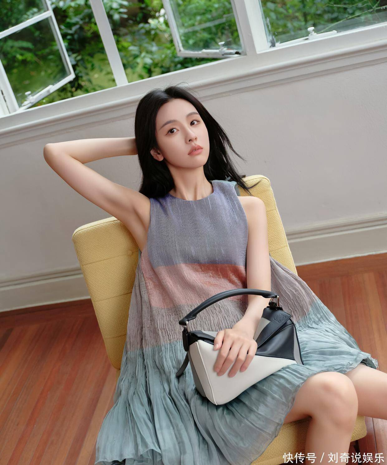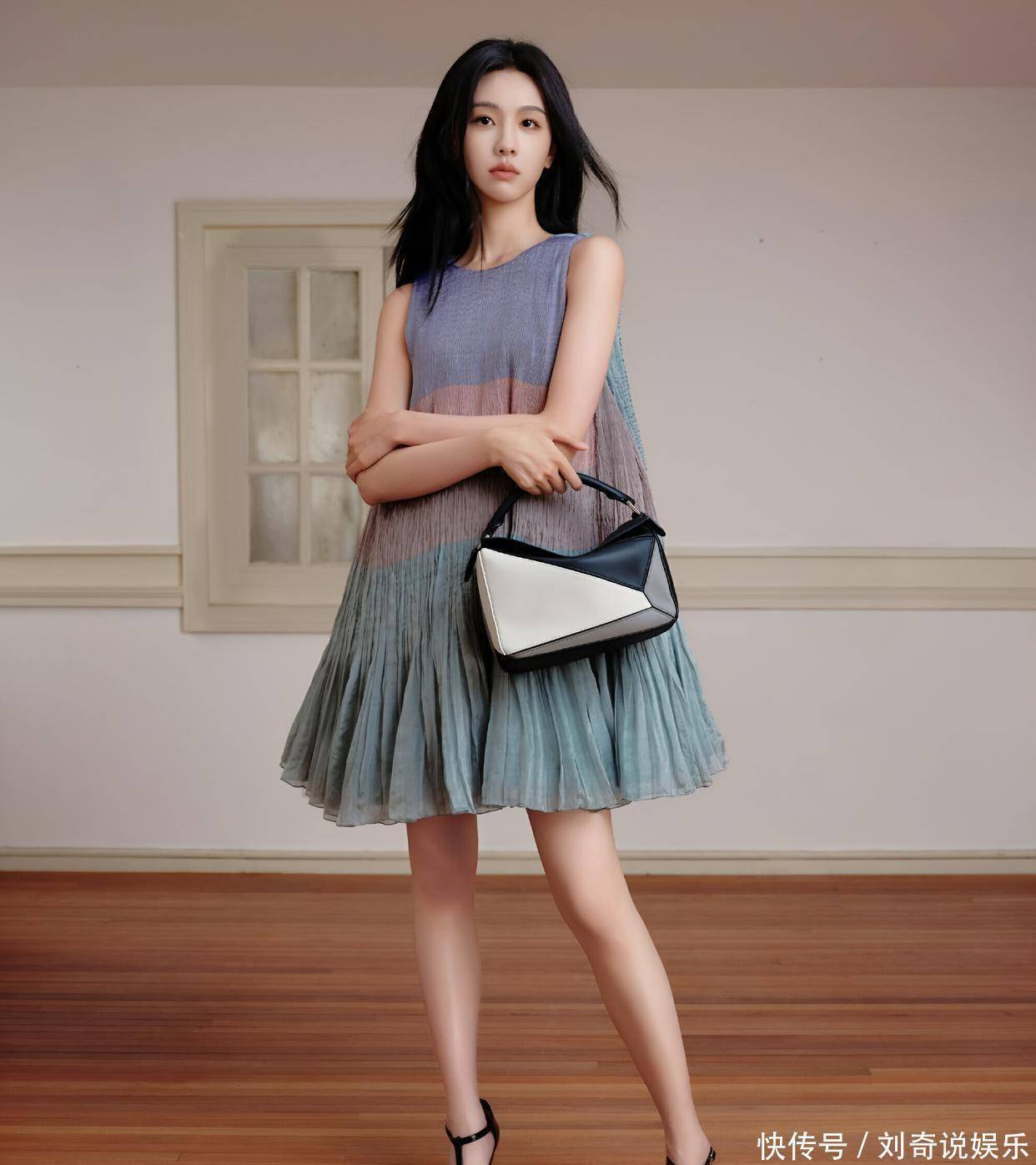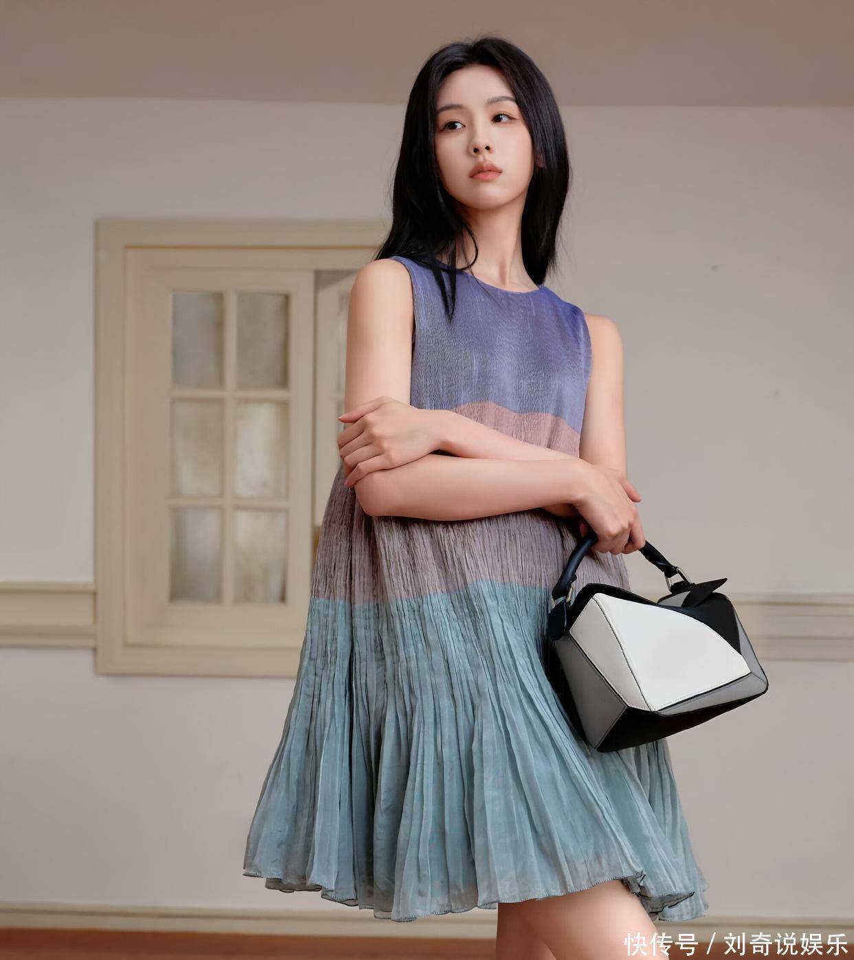 裙子的面料轻薄透气,还带有细腻的褶皱纹理,让裙子在静态时也仿佛有了动态的美感。宽松的版型,对身材十分包容,穿上身既有慵懒的随性,又不失优雅的格调。裙摆是微微散开的 A 字 型,走动时,裙摆轻轻摇曳,像一片轻盈的云朵,又像一汪流动的春水,充满了浪漫的气息。搭配的拼色手提包,设计感十足。黑白灰的几何拼接,简约中透着时尚,包包的线条硬朗,与连衣裙的柔和形成了鲜明的对比,却又相互衬托,让整体造型更加有层次。这只包包就像一个 “fashion statement(时尚宣言)”,彰显着独特的品味与个性。脚上的黑色 T 字带高跟鞋,复古的设计,精致的做工,为整套穿搭增添了一份干练与优雅。鞋跟的高度恰到好处,既提升了身高,又不会让人觉得疲惫,很好地平衡了舒适与美观。整体来看,陈都灵的这套穿搭,将优雅与时尚完美结合,每一个细节都处理得恰到好处,无论是参加活动还是日常出街,都能让她成为焦点,尽显迷人魅力。