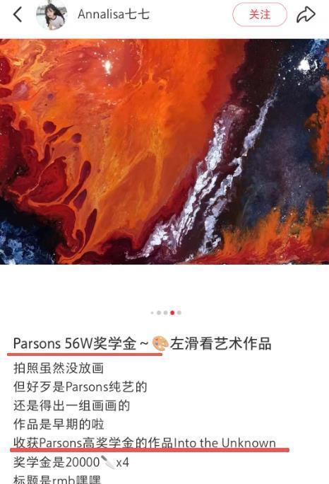 ?????? 那一年,她还发图分享自己的作品《intotheunknown》获奖,光是奖学金就高万元人民币。?????? 也就是说,七七不仅是网红,还是一个有艺术天分的才女,跟林俊杰走到一起后,她还利用所学专业,担任男友名下潮牌SMG配饰的创意总监。