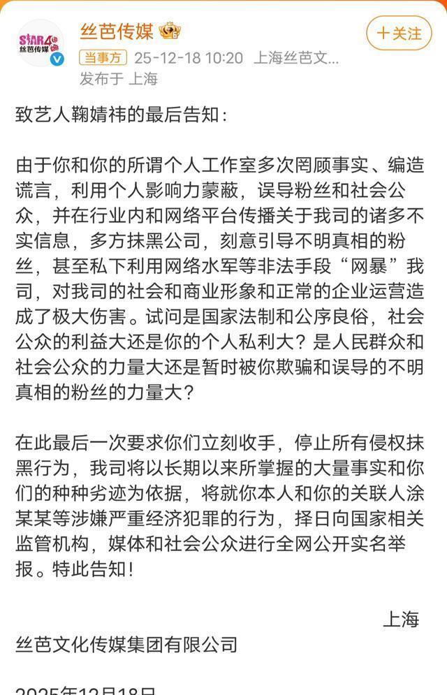 ?????? 聊天记录中明确提到“合约我一定要解约”,并暗示持有退团时完整证据链。?????? 丝芭通过律师声明否认“陪酒”属不实信息,但未质疑聊天记录真实性,也避谈收入分成、合同霸权等系统性问题,被批“避重就轻”。?????? 03?????? 丝芭日同步发布《致鞠婧祎的最后告知》,威胁举报其“涉嫌严重经济犯罪”,但未提供具体证据。此举被解读为转移陪酒争议焦点。