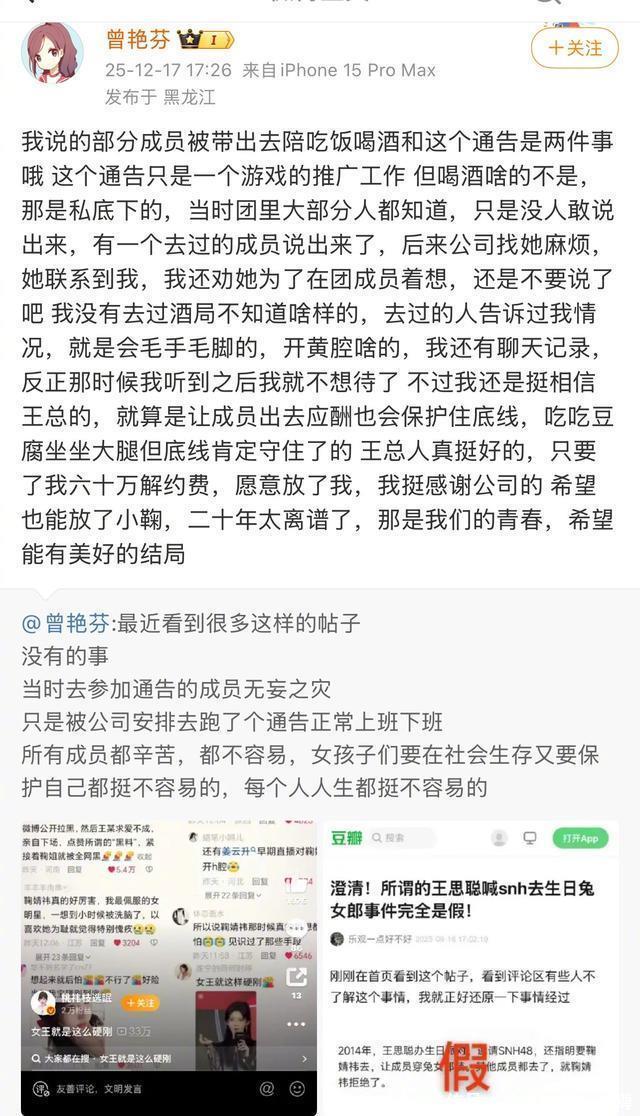 ?????? 01?????? 12日,曾艳芬发文?????? 称丝芭传媒选择性安排部分成员参与陪投资方喝酒的应酬活动。