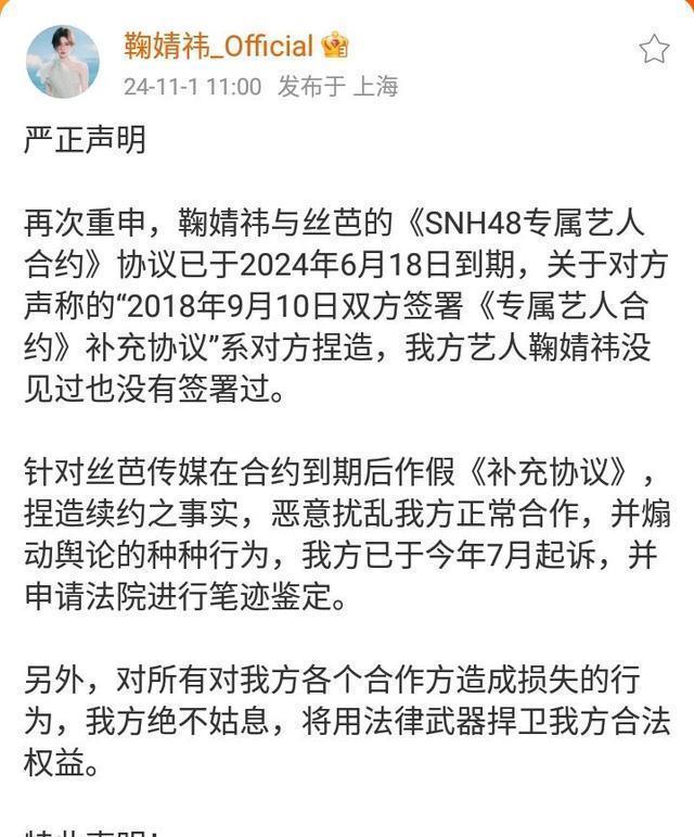 ?????? 鞠婧祎主张原合月到期,丝芭称补充协议延年,但法院两次笔迹鉴定均“无法确认真实性”。