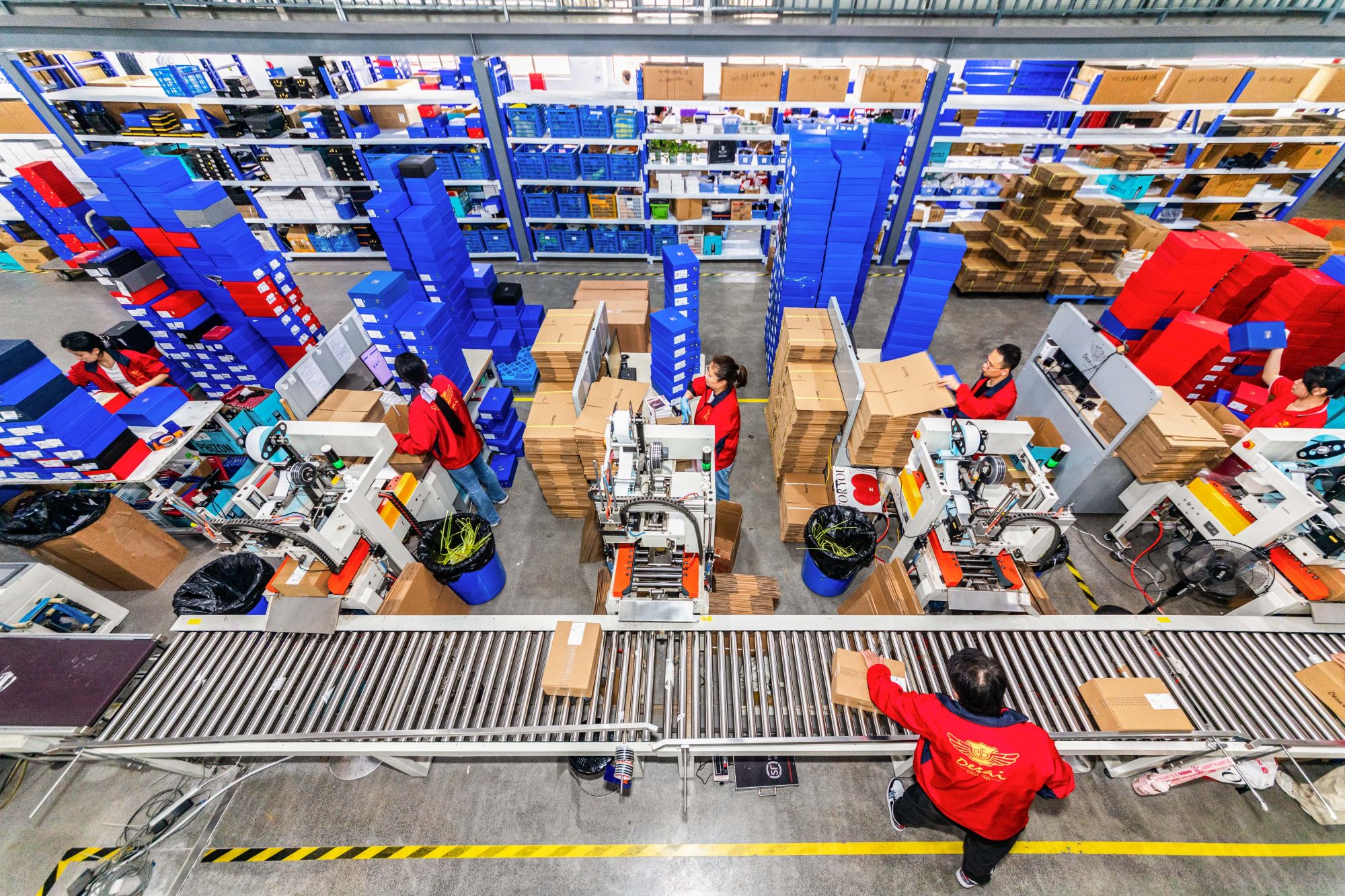 2025月,在位于浙江省温州市的德赛集团物流园内,工作人员在对发货鞋类产品进行分拣、打包。新华社发(刘吉利摄)