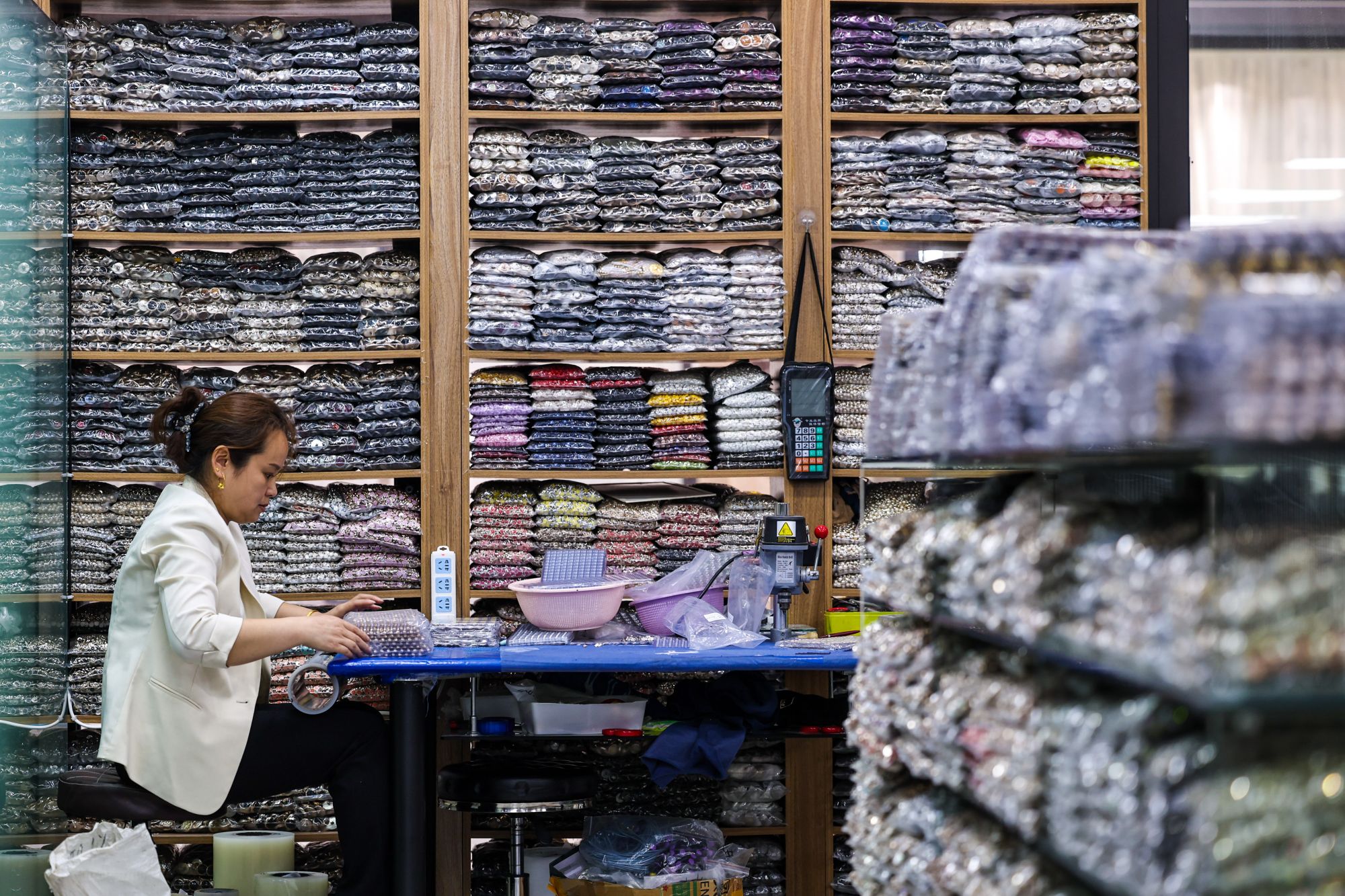 2025月,在温州永嘉县桥头商贸中心一家经营钮扣产品的店铺内,员工在打包钮扣产品。新华社记者 江汉 摄