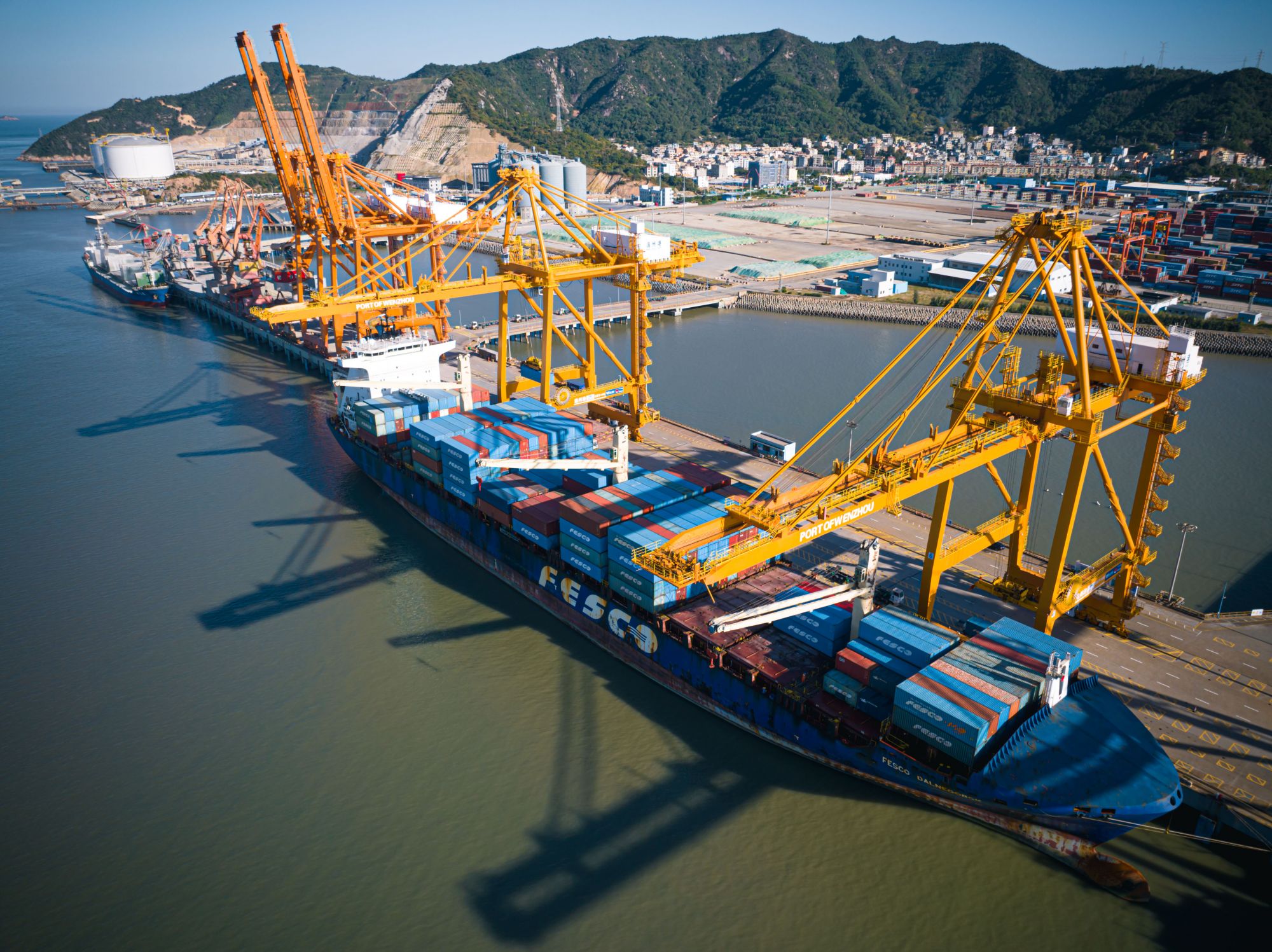 货轮停靠在温州港状元岙集装箱码头卸载集装箱(无人机照片,2023日摄)。新华社记者 江汉 摄