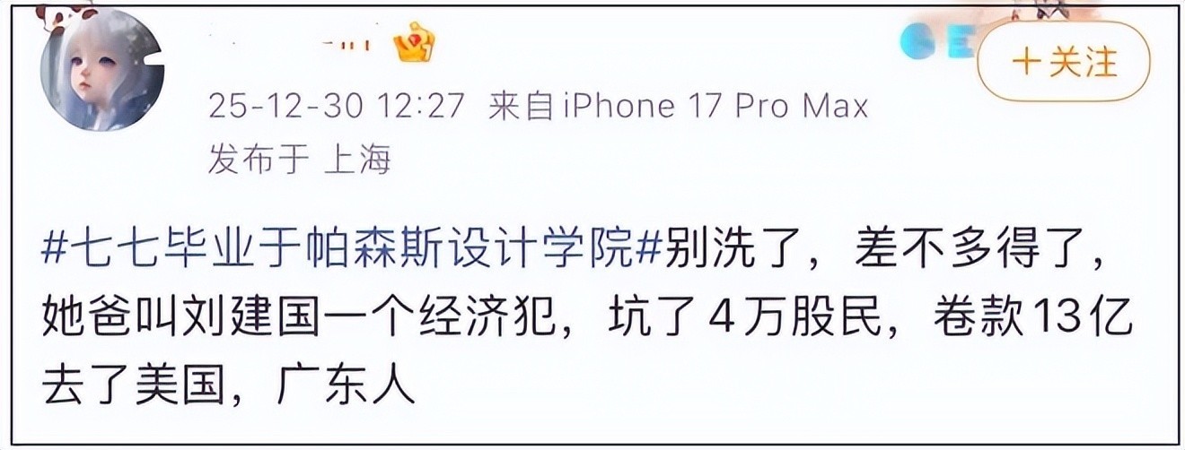 即便上述行为可视为个人审美选择,但她背后的家庭背景疑云,才是真正引发争议的核心。出身成谜,豪门设定站不住脚资料显示,七七真实姓名或为刘偲敔,有网友进一步挖掘发现,其父疑似牵涉一宗金额高亿元的经济案件。