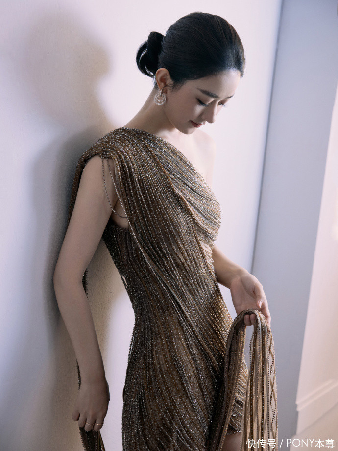 赵丽颖此次选择的 Cong Tri 斜肩鎏金短裙,堪称 “高定与氛围感的完美融合”。斜肩设计大胆又精致,一侧露肩完美展现出她优越的肩颈线条 —— 肩线平直、脖颈修长,没有多余赘肉的线条感,让整体造型更显轻盈;另一侧肩带则巧妙衔接裙身,避免了过度暴露的俗气,多了几分优雅克制。