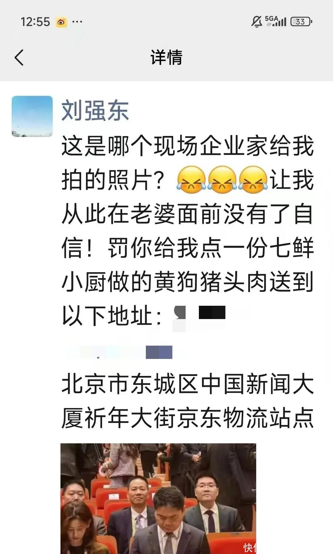 于是,刘强东干脆在朋友圈亲自调侃,用幽默口吻问:“哪位企业家朋友把我拍成这样?让我在太太面前都没了自信?!?#20182还顺势开玩笑说,“补偿我一下,请给我点份外卖吧?!?#32780这顿外卖点的正是他家乡江苏宿迁的传统名菜,既接地气又有深意。