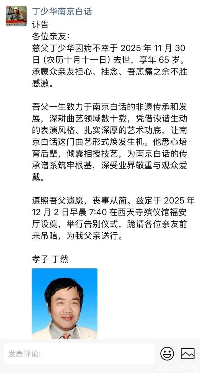 蓝天透露,半个月前还和恩师一同筹划着下一场敬老院慰问活动。他说:我对恩师的崇敬与崇拜,早已融入这三十年的师徒情谊中。他的离去太过突然,就在半个月前,我们还一同筹划着下一场敬老院慰问活动,如今却天人永隔。这份未竟的公益心愿,成了我们心中永远的遗憾,也更让我们铭记他一生的赤诚与坚守。恩师虽逝,风范永存,他的公益精神与曲艺情怀,我们定会代代传承!