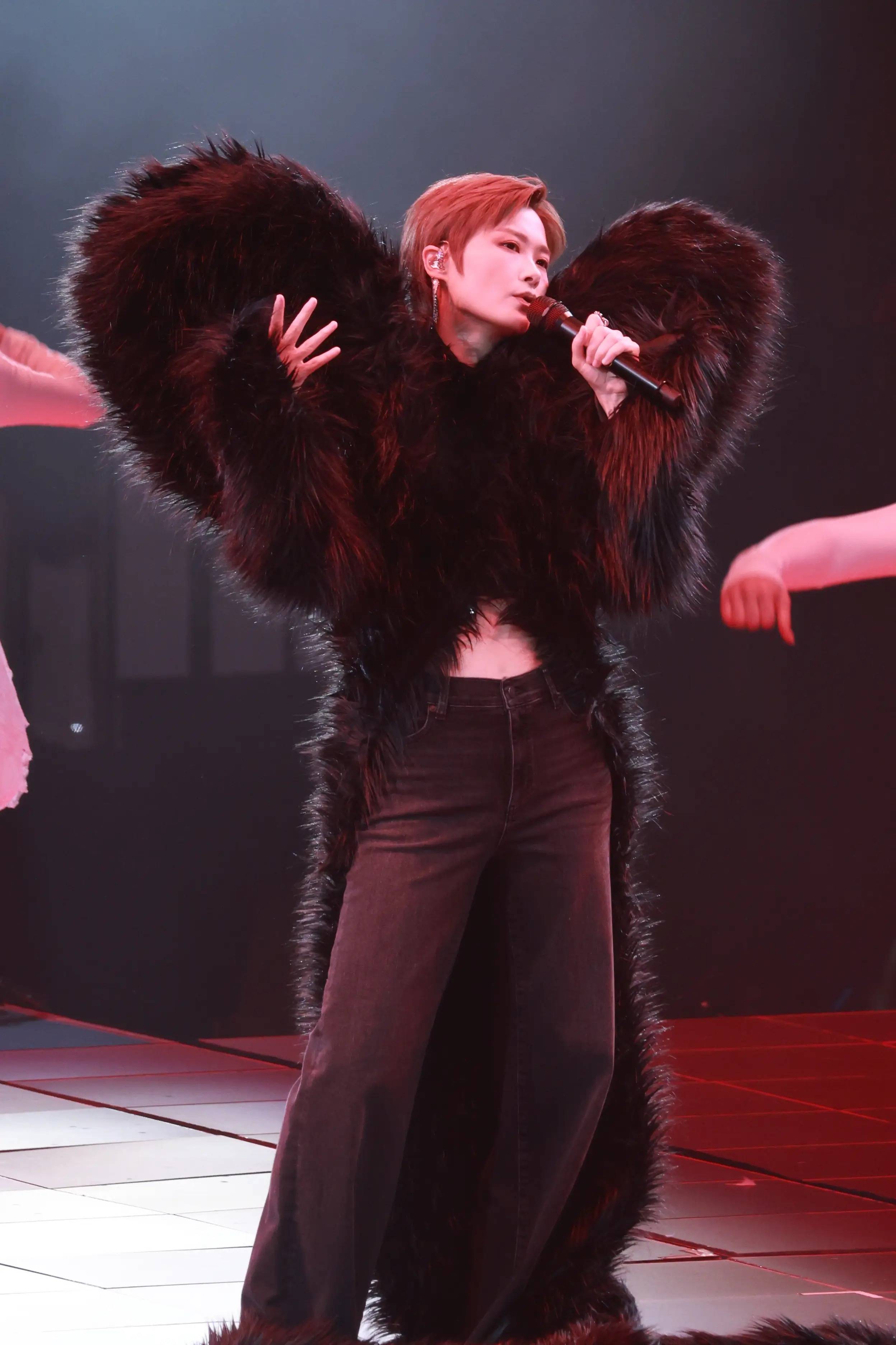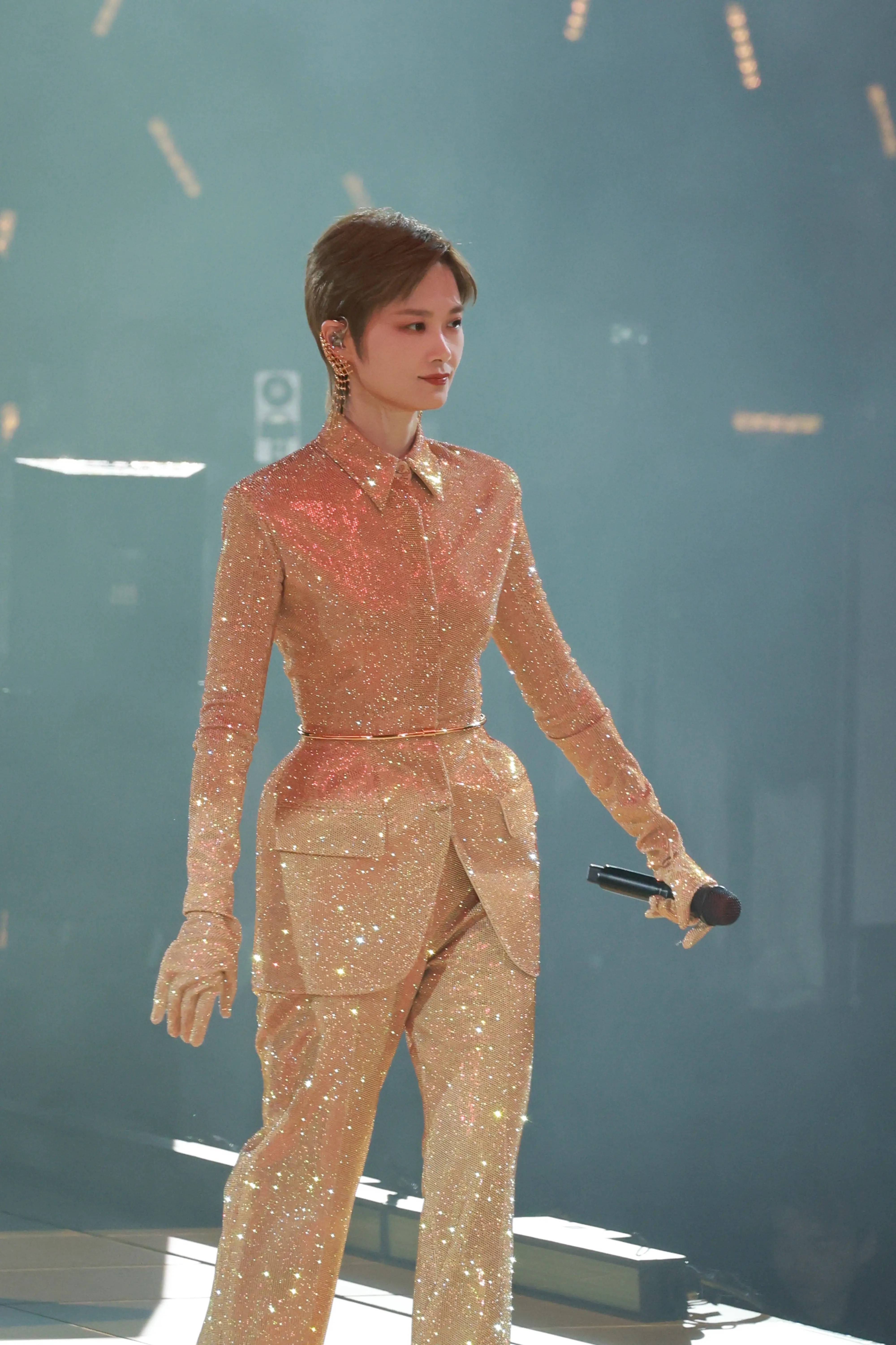当晚的李宇春舞台造型也是华丽多变,无论金色亮片套装,抑或是黑色羽毛造型的“新皮肤”,还是一袭露背红裙,或是绿色条纹衬衫搭配短裙,精致养眼,超A。