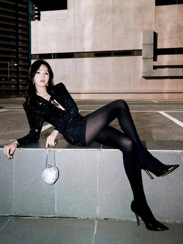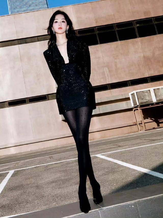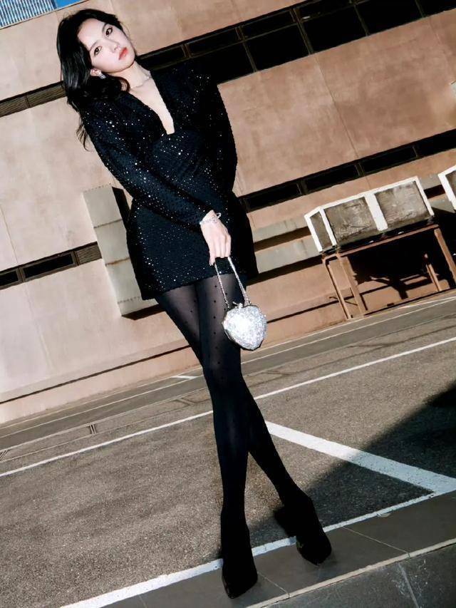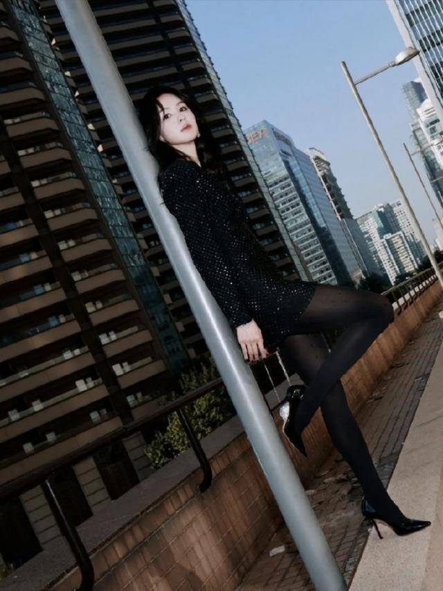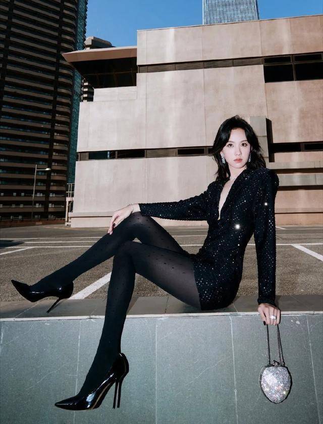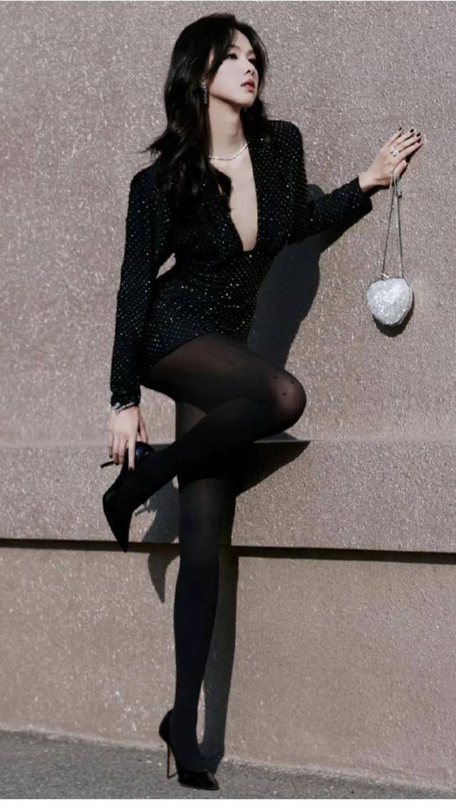 黑色的服饰与黑色的丝袜,再加上脚上的那双恨天高,无疑是将陈都灵的美推上了另一个高度,让其更加的魅力无限。