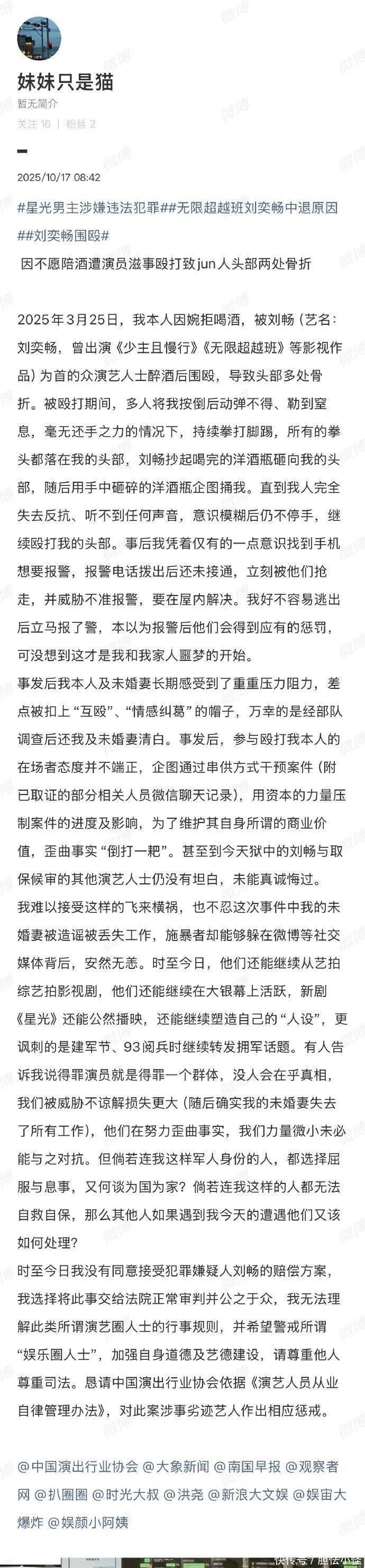 10日,有网友发布长文称,自己因不愿陪酒遭刘奕畅等演员滋事殴打致头部两处骨折。刘奕畅本人因此事已被关入看守所,涉及艺人刘奕畅的部分,目前已移送至人民法院等待刑庭排庭审判,其他同案人员取保候审中。
