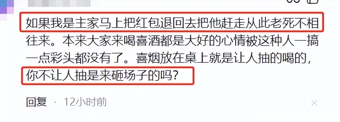 新人办婚礼图的是团圆喜庆,宾客前来捧场,主家巴不得大家吃得开心、喝得尽兴,甚至主动发放喜烟以表心意,她却强行介入破坏气氛,还引以为荣。