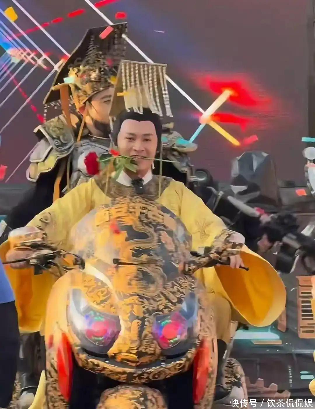 郑国霖穿上龙袍的样子,让人想到了他曾扮演的“李世民”,确实很有那种帝王的感觉。这张照片中,他完美还原了“李世民”的经典造型,穿着一身明黄龙袍,头上戴着金冠,嘴里叼着玫瑰,骑着一辆摩托车呼啸而过。