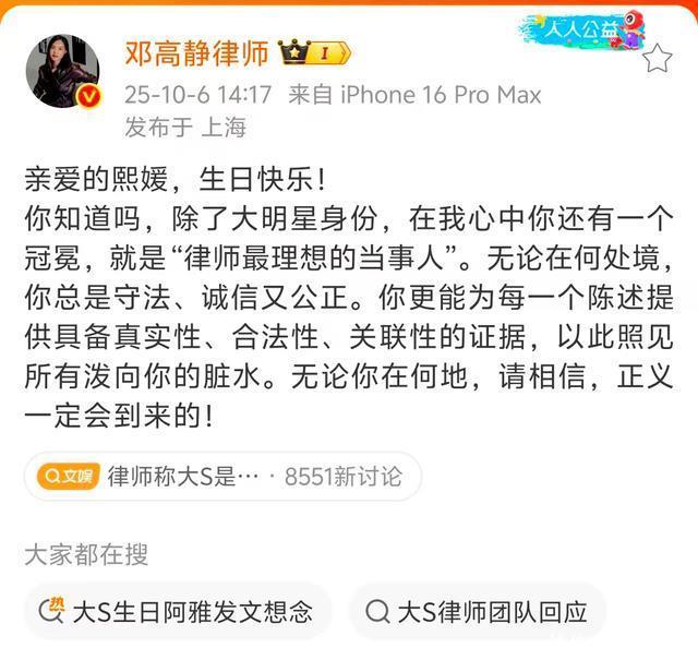 ?????? 之前大S上节目的时候就曾说过,经常和阿雅通话通好久,一天通好几个电话。?????? 最让人想不到的是,就连大S生前的律师邓高静,都发文怀念她了。