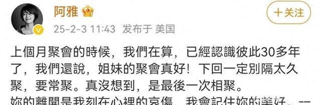 ?????? 直言她走了以后,这一天就不快乐了,因为这一天是她的生日,?????? 这些年总是会有各样的言语,经常说她们两个似乎闹掰了,但是从阿雅的怀念里,大家知道其实她们的关系一直都很好。