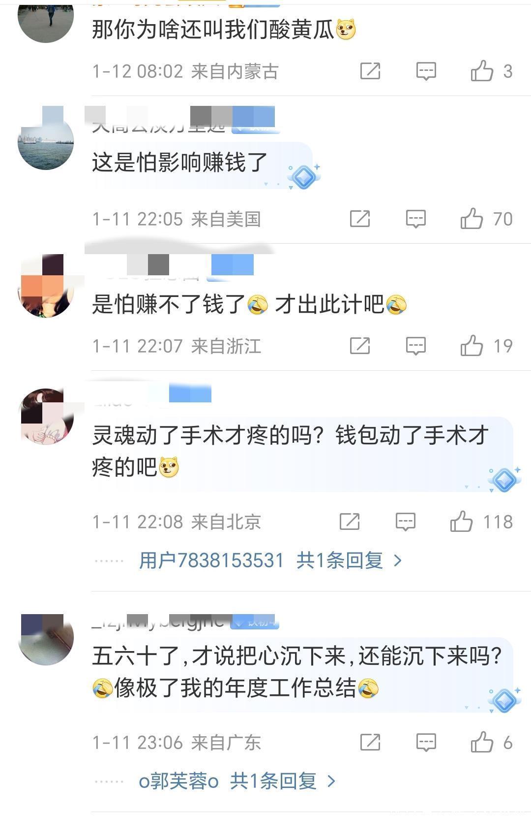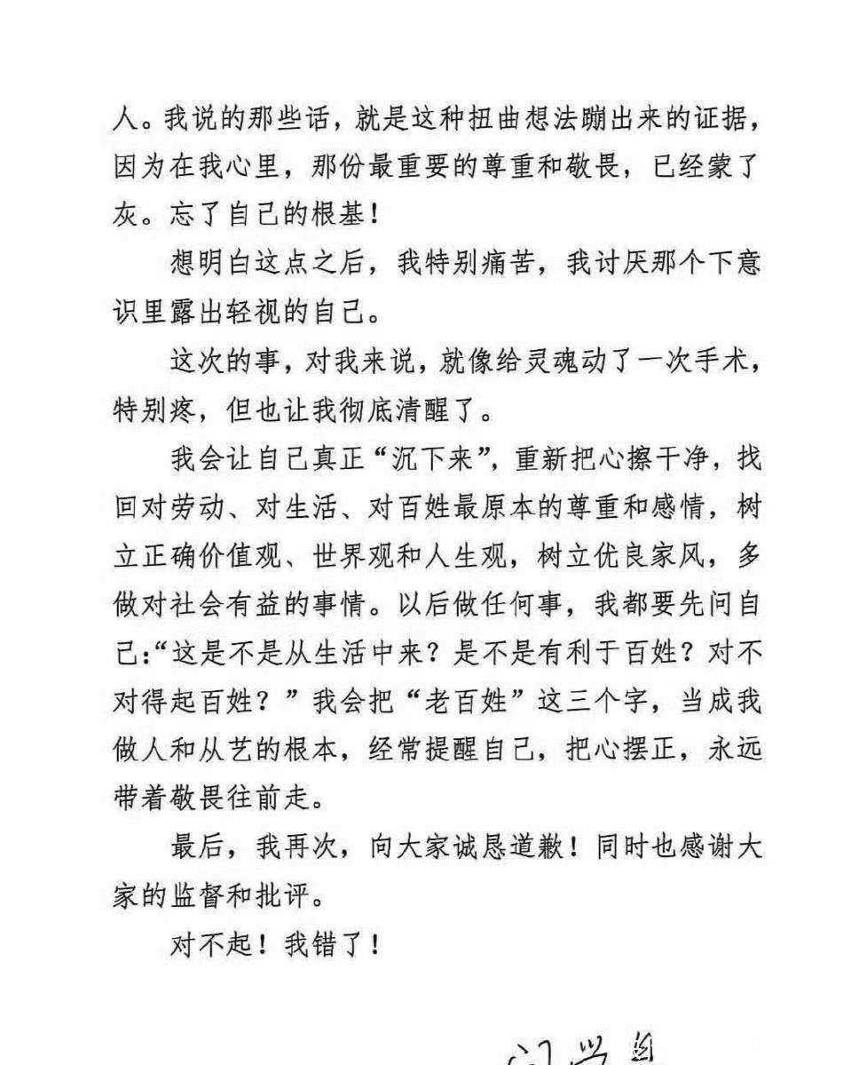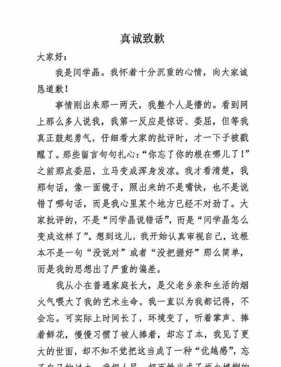 其实整体看,闫学晶的道歉信还是蛮真诚的,她承认了大家对她的批评,觉得自己的确是忘了本,以后会检讨自己。沉下心来改正自己的错误,虽然道歉信很诚恳,文笔也不错,但是网友在下面评论还是骂声一片,晚了。以下是网友的评论:晚了,就撤销一级演员吧!文案写的挺好,是自己写的吗?该不会有花钱请人写的?波及她儿子,她怕了。她不是真的知道错了,而是害怕发财的路没了。不过也有个别的网友表示理解:杀人不过头点地,网友还是算了吧,毕竟她说的话,在那个圈子里,也算是实话。没想到却捅了马蜂窝,这可能也不是她想的。