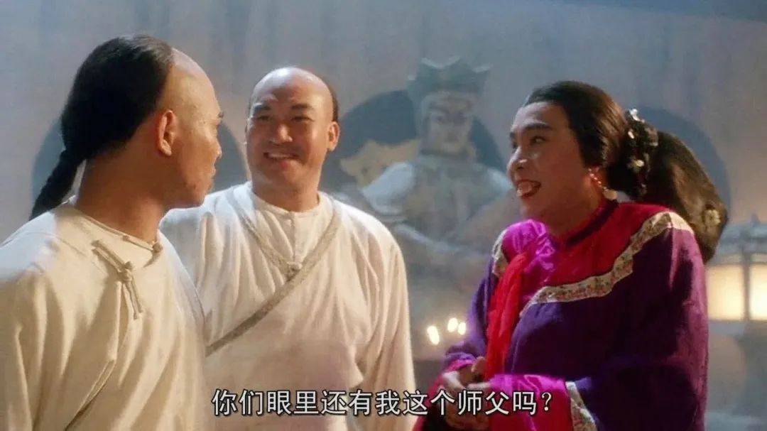 1993年《黄飞鸿之铁鸡斗蜈蚣》中,张卫健饰演的牙擦苏,在能仁寺诱捕邪僧时,穿的紫色女装正是之前陈百祥那件。