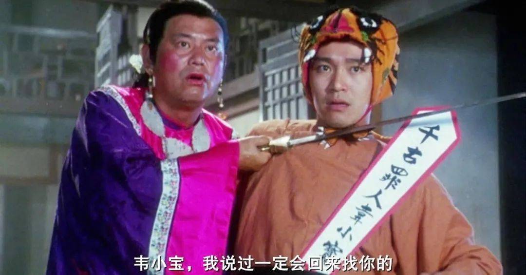 1992年《鹿鼎》中,陈百祥饰演的多隆,在有间客栈中接应韦小宝,换了一身紫色的女装。