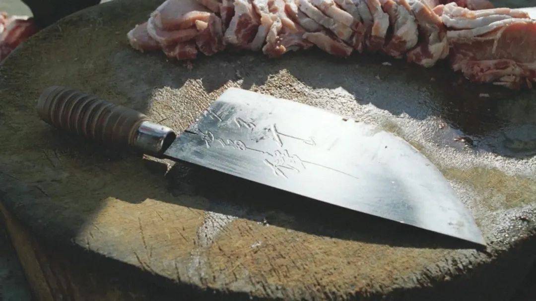 很明显,刀上面没有刻字,也没有写字,但从刀身的形状特征,刀柄的纹路,可以看到,这把菜刀和《国》的杀猪刀是同一把。只不过显得旧了一些,少些光泽,毕竟放𱄾年。