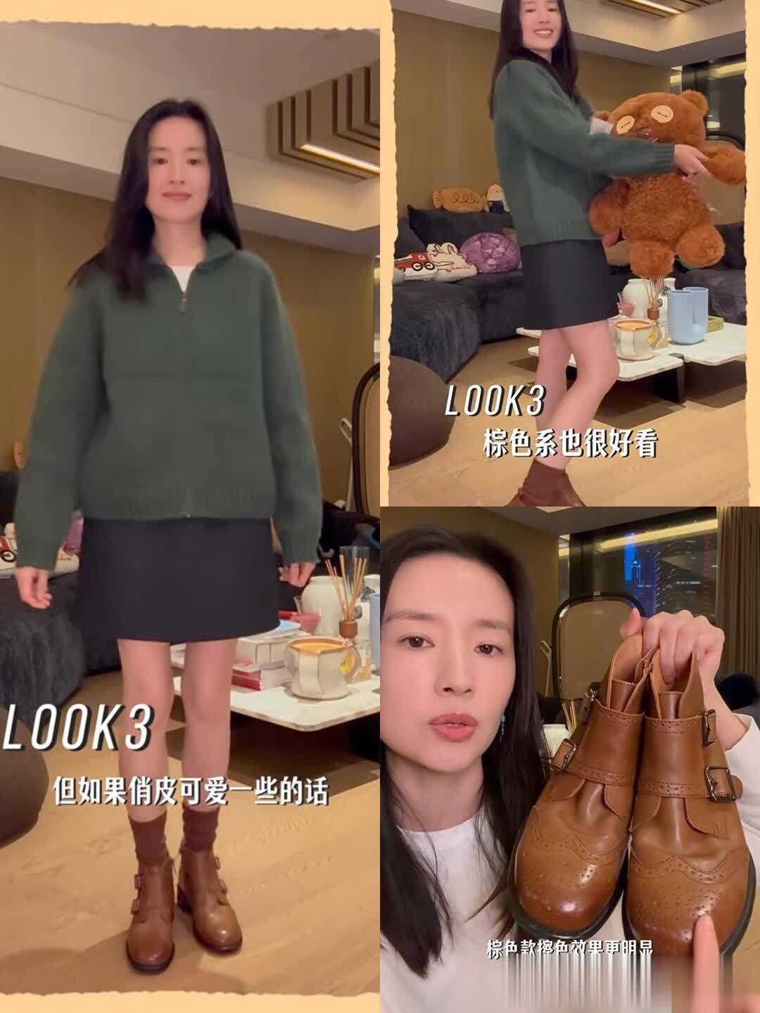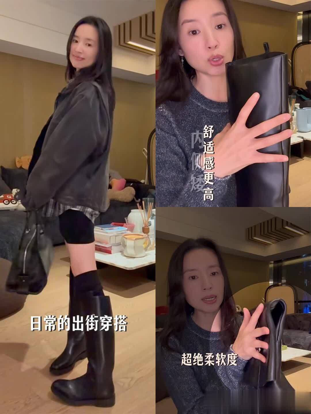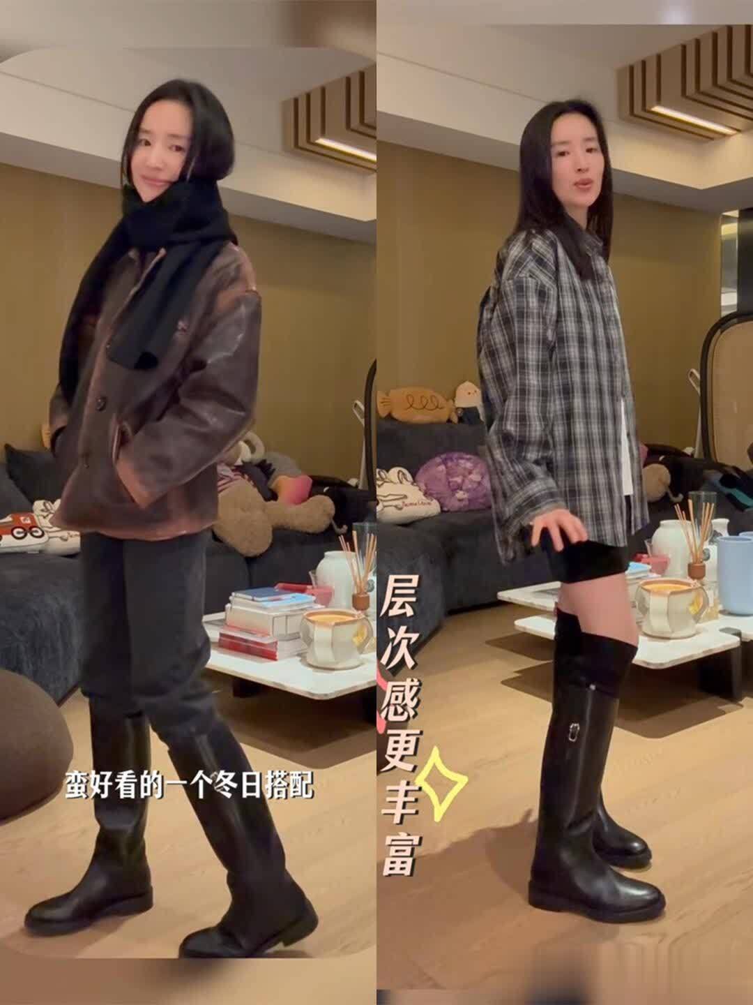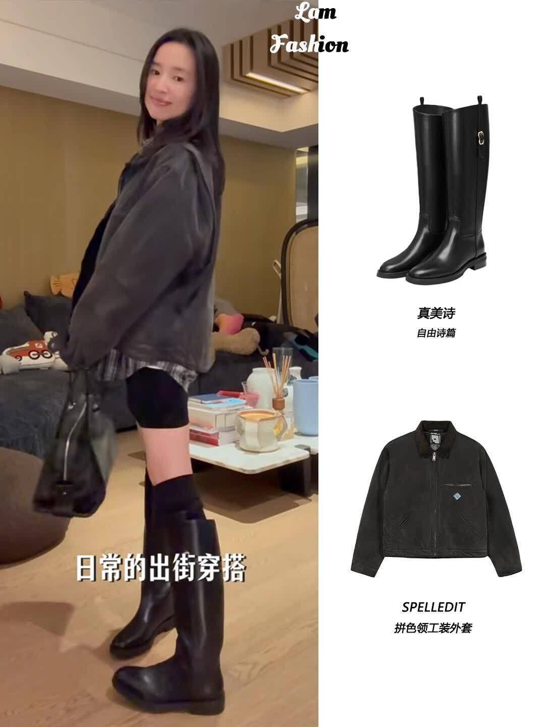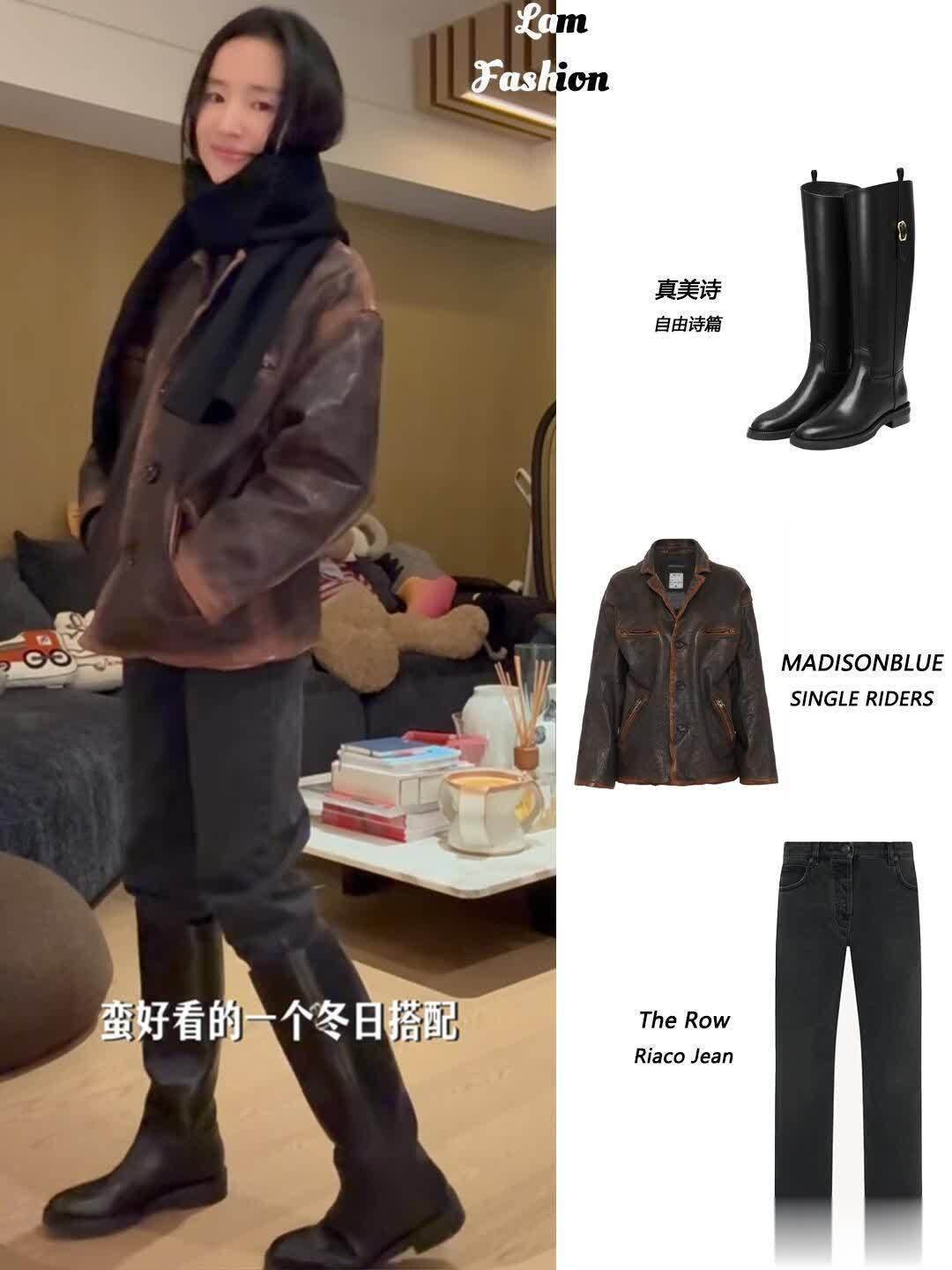她分享的那几双靴子更是实用到想抄作业!黑色切尔西靴是短款的,靴口刚好到脚踝最细的地方,她搭了条九分烟管裤,露出一小截腿,配件燕麦色针织开衫,去咖啡馆坐一下午都舒服。还有双棕色骑士靴,靴筒到膝盖下方,她居然搭了条米白色百褶裙,裙摆盖过靴口一点点,上面穿件短款皮衣,柔中带飒的感觉太妙了——原来骑士靴不止能配酷飒风,搭温柔系裙子也这么好看。