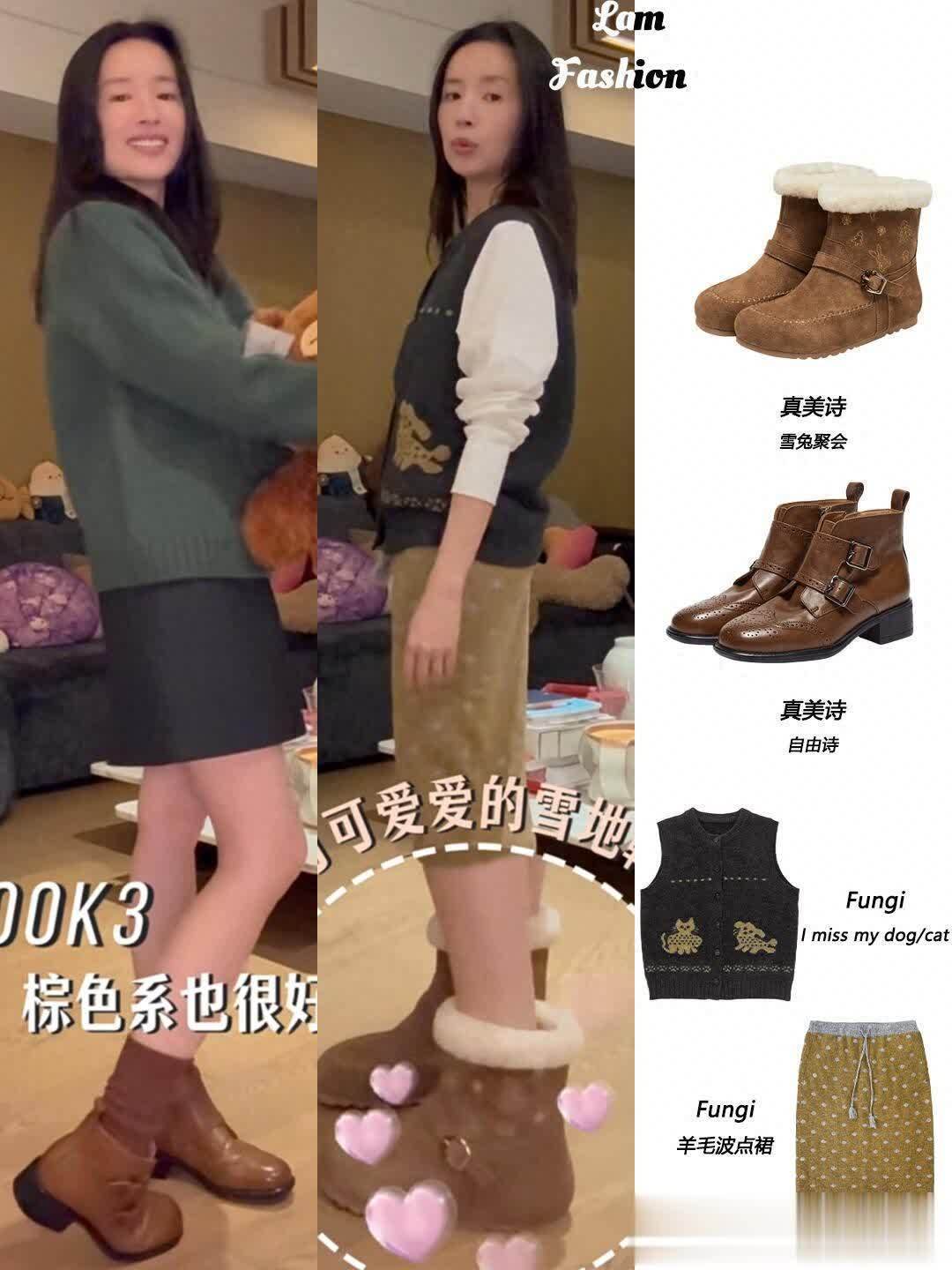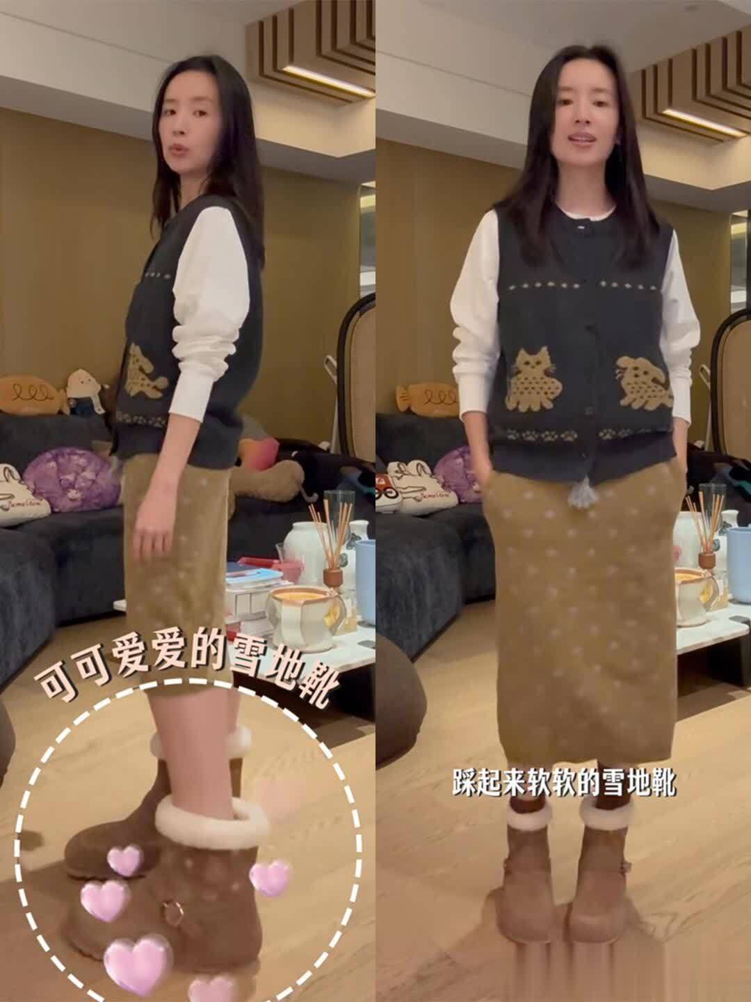 雪地靴那套更是打破偏见!很多人觉得雪地靴显臃肿,董洁选了双浅棕色短款,配了条浅卡其色加绒卫裤,裤脚塞进靴子里,上面套件oversize的灰色卫衣,戴顶同色系针织帽,去滑雪场玩的时候拍了组图,像个邻家姐姐一样亲切,完全没有“穿得像熊”的尴尬。她自己说“冬天穿得暖和比啥都重要,选对版型就不会显胖”,果然是把舒适放在第一位的人。